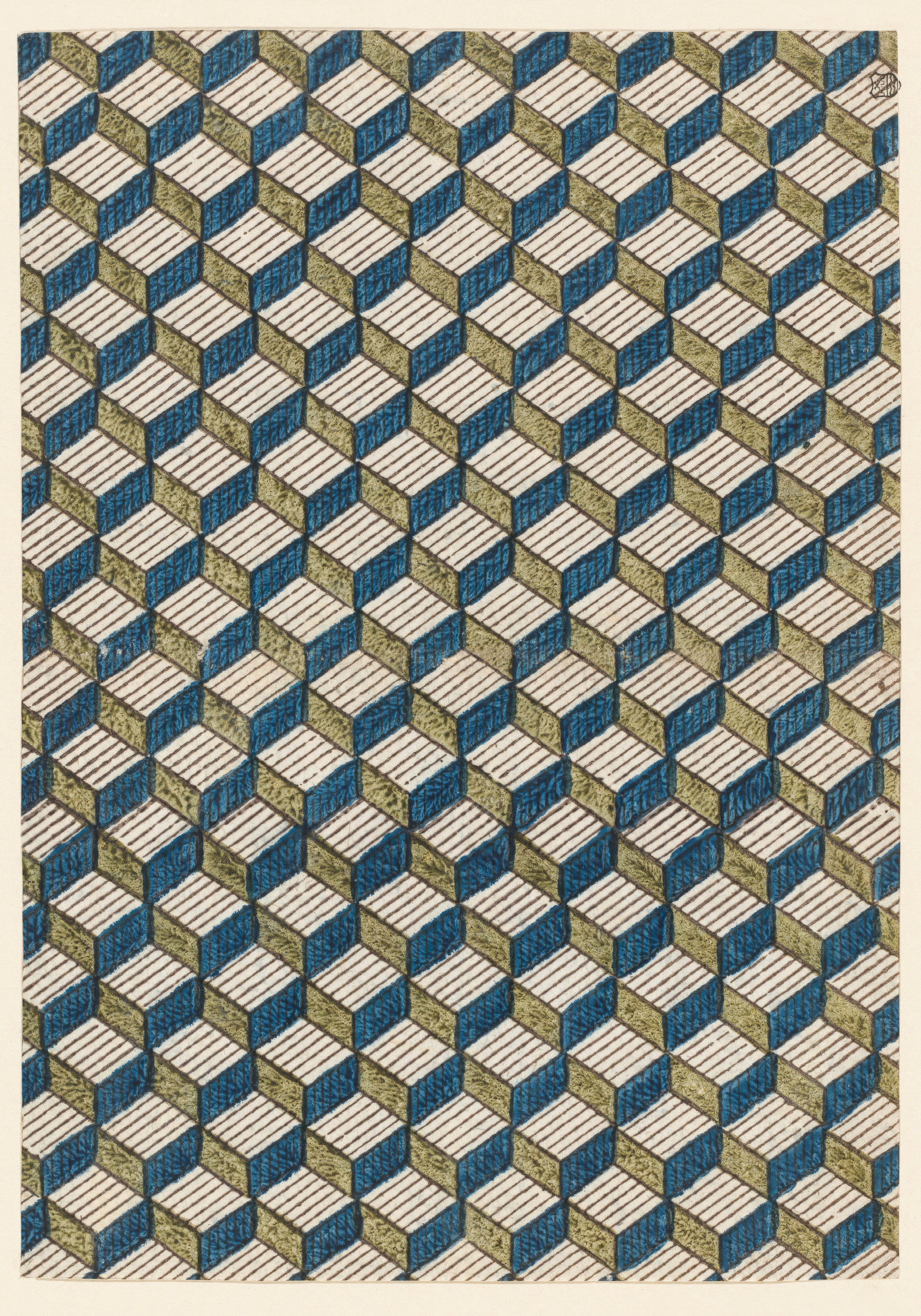 青、緑、白の3色で作られた立方体のパターンです。線と質感が3Dの箱のように見える不思議なデザインです。繰り返される幾何学模様が空間に奥行きを生み出します。