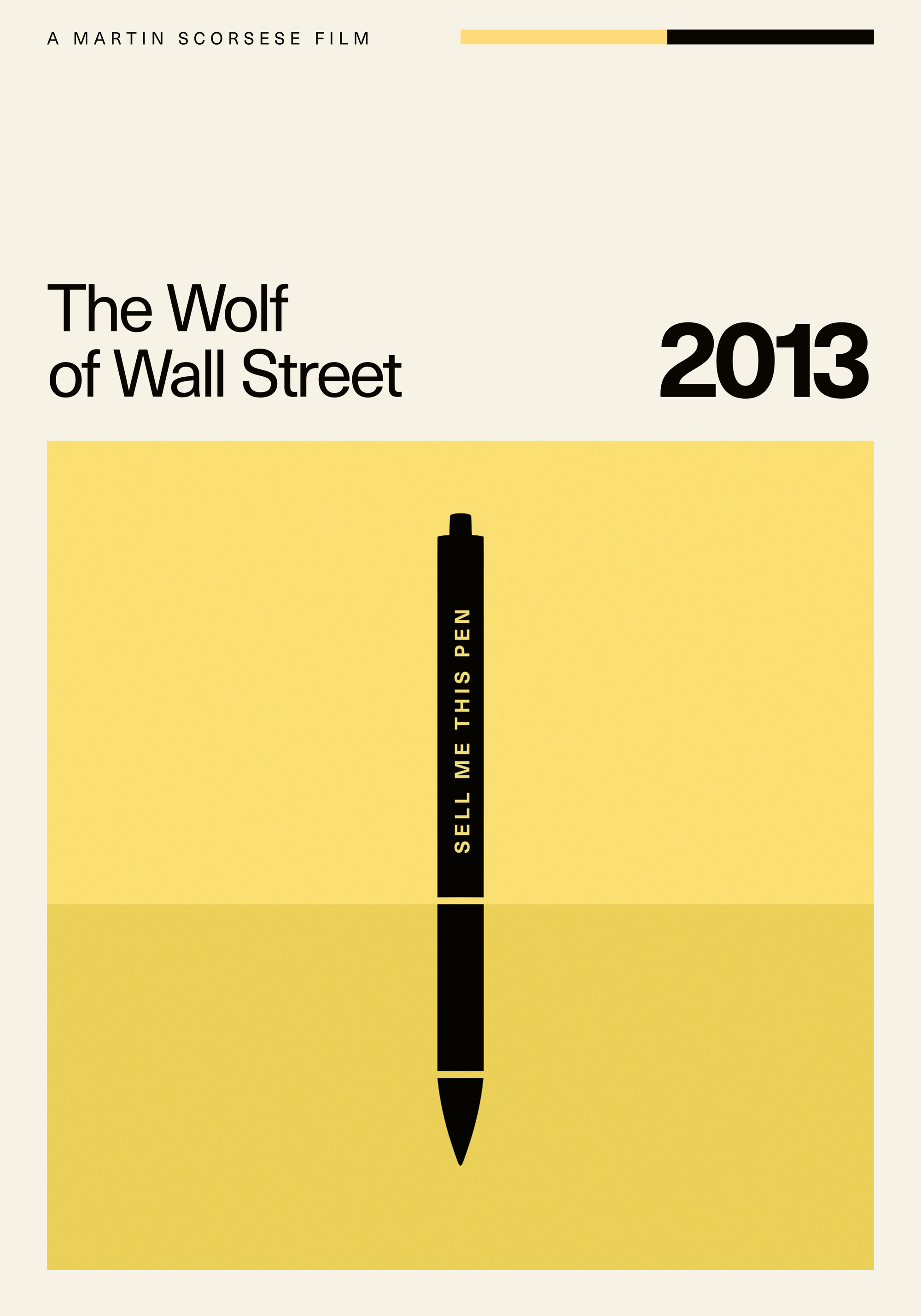 「ウルフ・オブ・ウォールストリート」の有名なシーンを描いたポスター。クリーム色と黄色の背景に黒いペンと「SELL ME THIS PEN」の文字が特徴的です。