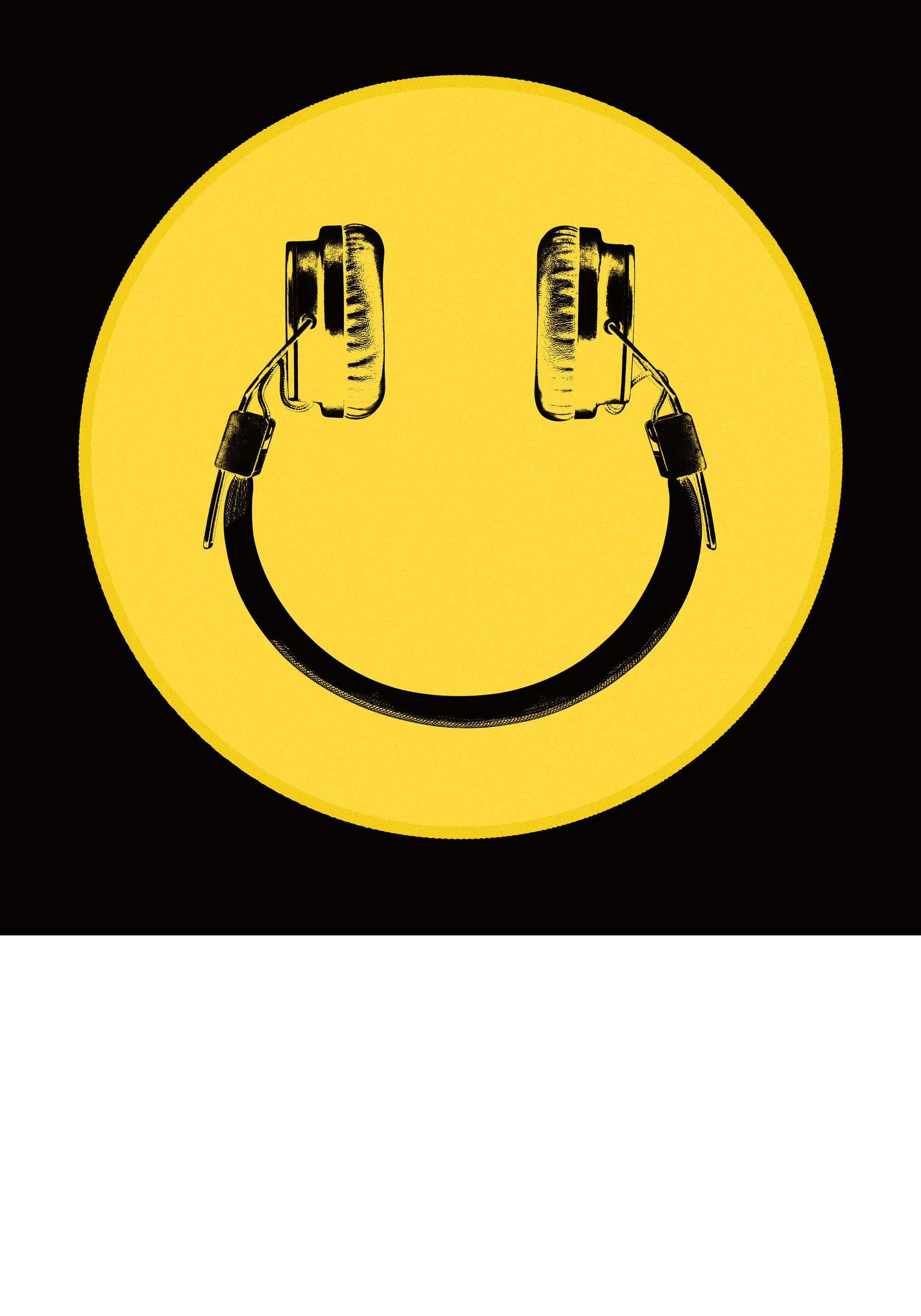 黒い背景に明るい黄色の円が描かれたポスターです。ヘッドホンが目になり、ケーブルが笑顔の口を作っています。音楽を楽しむスマイリーフェイスのデザインです。