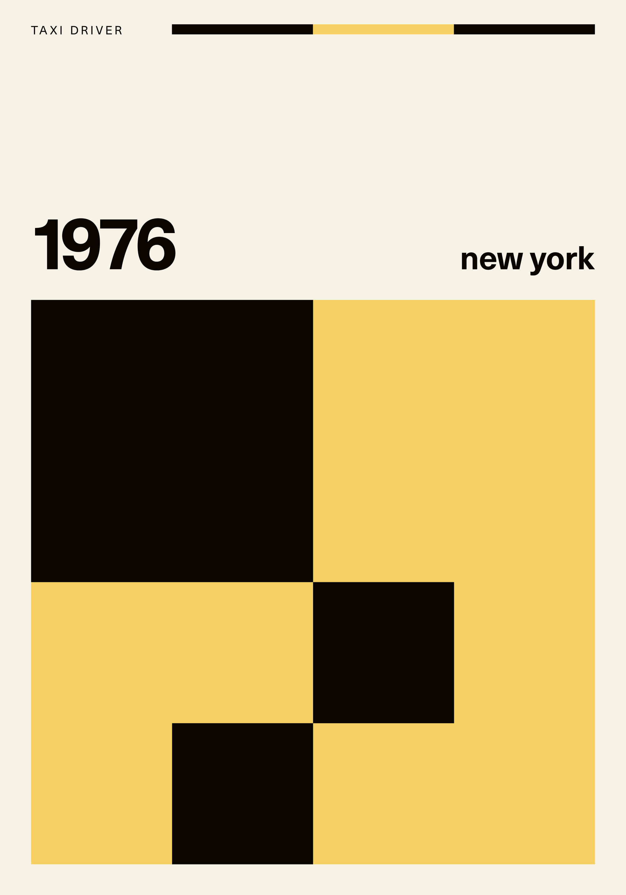 ベージュの背景に「TAXI DRIVER」と「1976」、「New York」の文字が入ったポスター。黒と黄色の四角いパターンがタクシーをイメージさせるシンプルでモダンなデザインです。