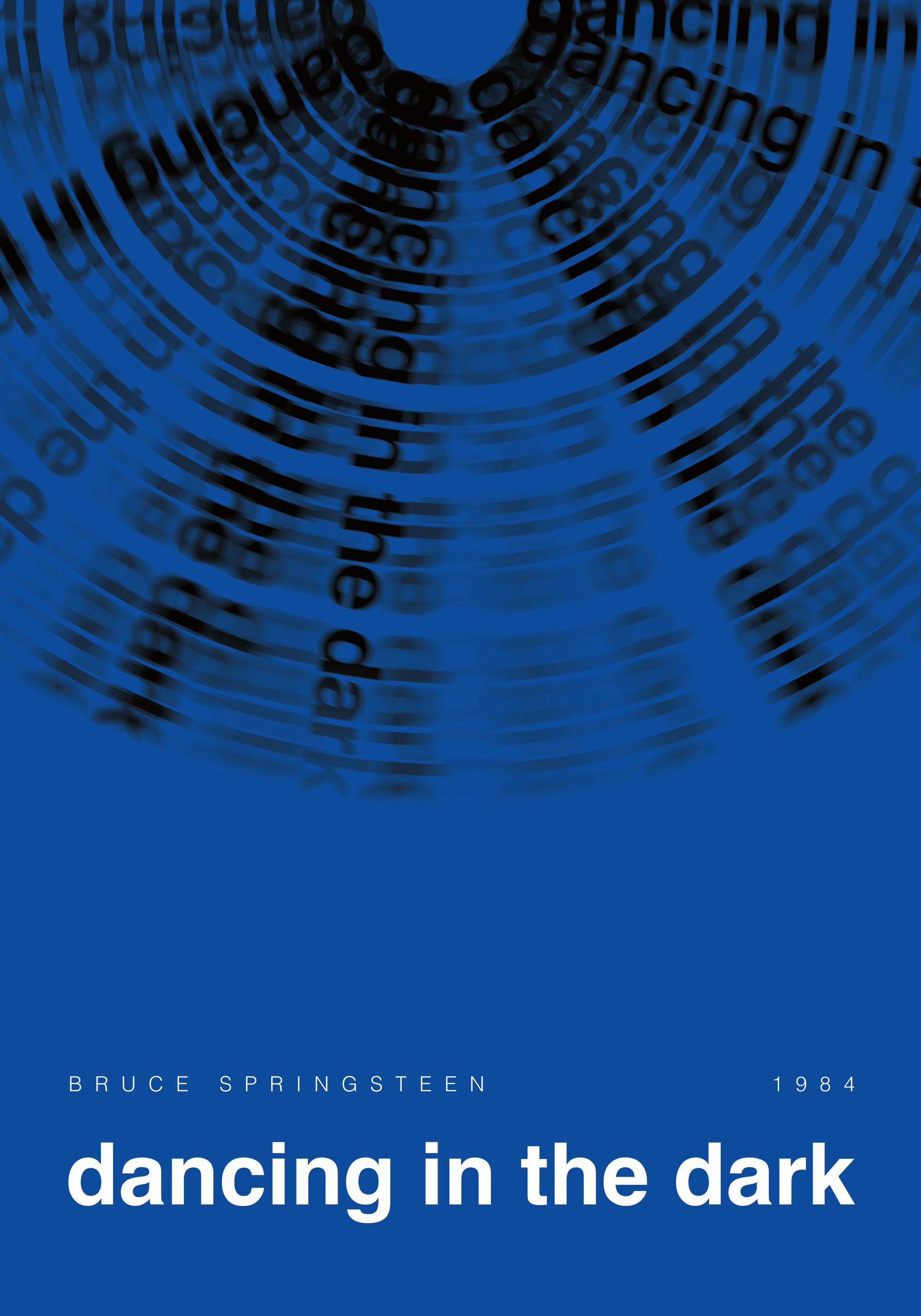 ブルース・スプリングスティーンの名曲「Dancing in the Dark」をモチーフにしたポスター。青い背景に白い文字が渦巻き状に配置され、トンネルのような奥行きを感じさせるデザインです。
