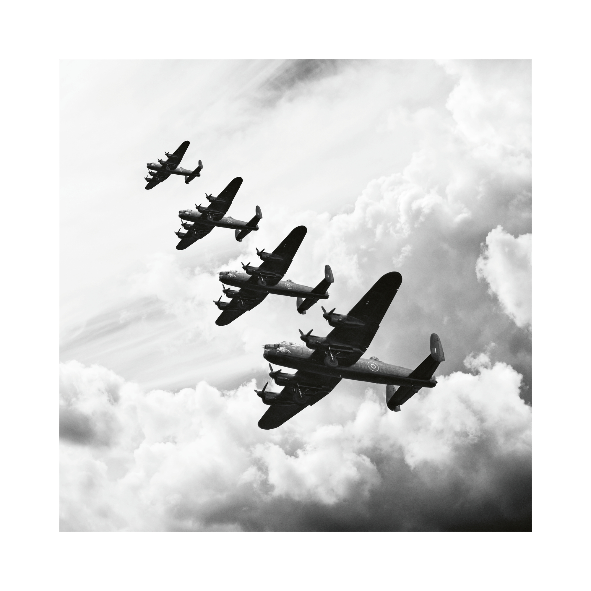白と黒の写真で、5機の飛行機が雲の中を飛んでいます。ドラマチックな空のポスターです。