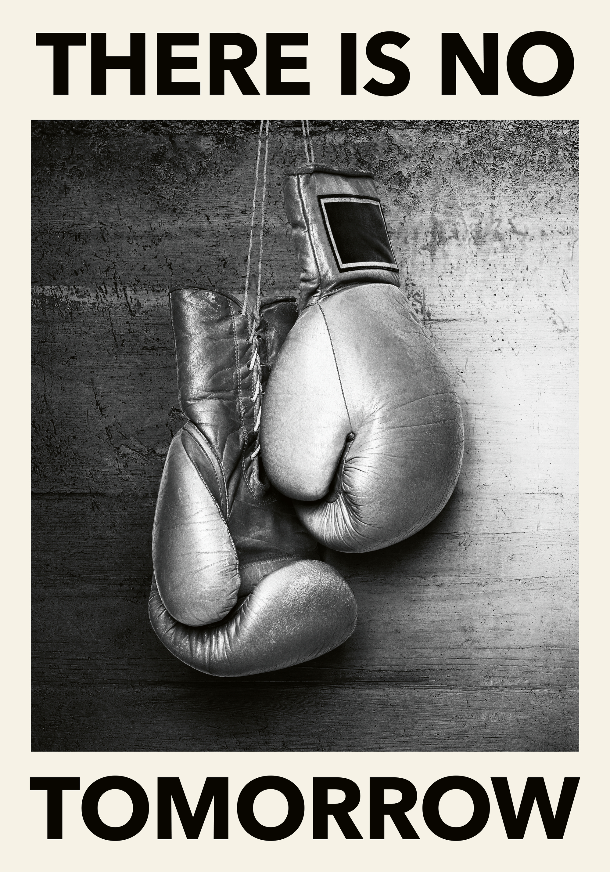 コンクリートの壁にかかる2つのボクシンググローブのモノクロポスター。「THERE IS NO TOMORROW」のメッセージ入り。スポーツの情熱とやる気を表現したクールなアート作品です。