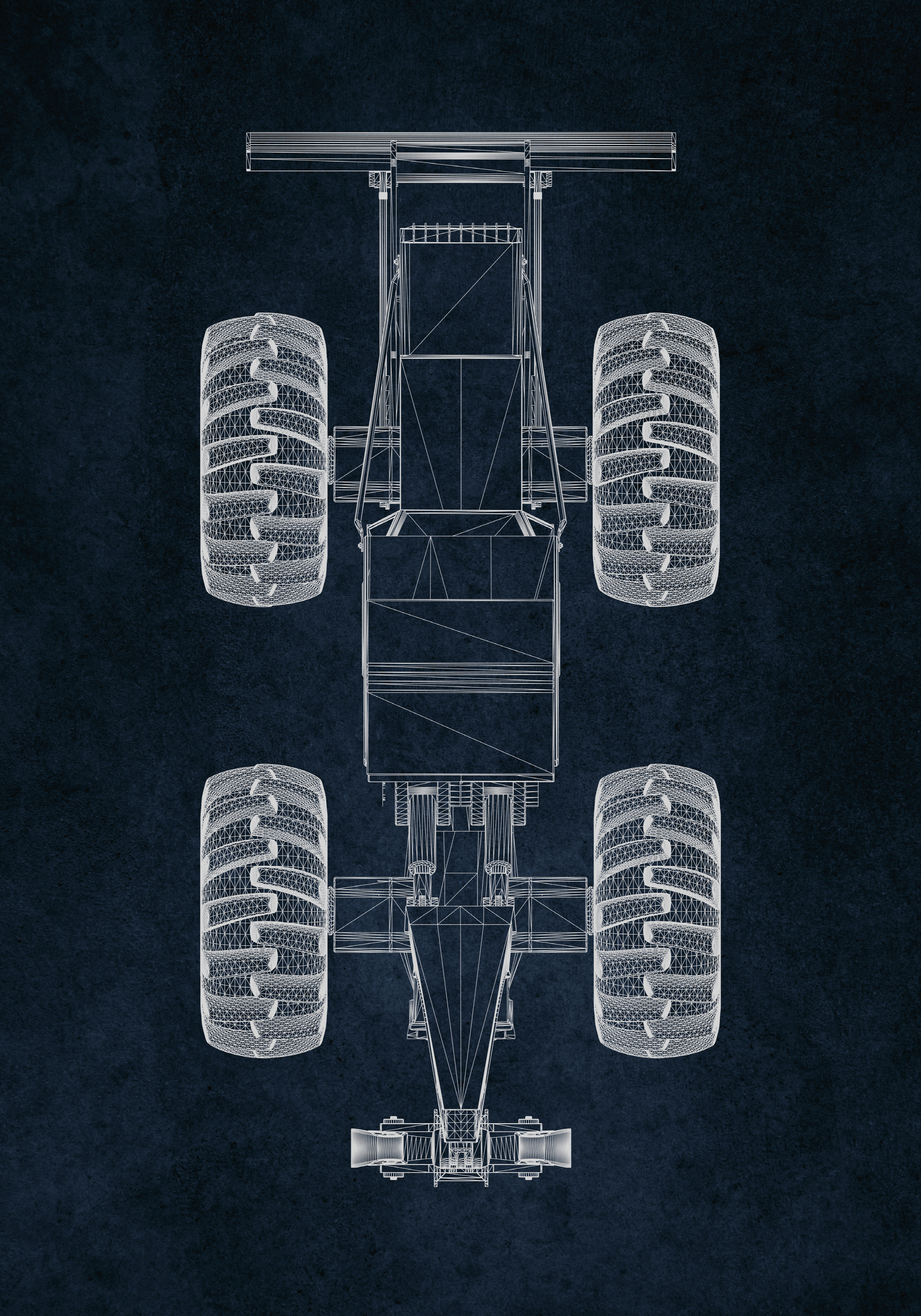 ダークブルーの背景に白い線で描かれたレーシングカーの設計図ポスターです。上から見た車の形がはっきりと見えます。四つの大きなタイヤにはジグザグ模様があり、車体は幾何学的なラインで構成されています。シンプルでクールなデザインが特徴的です。