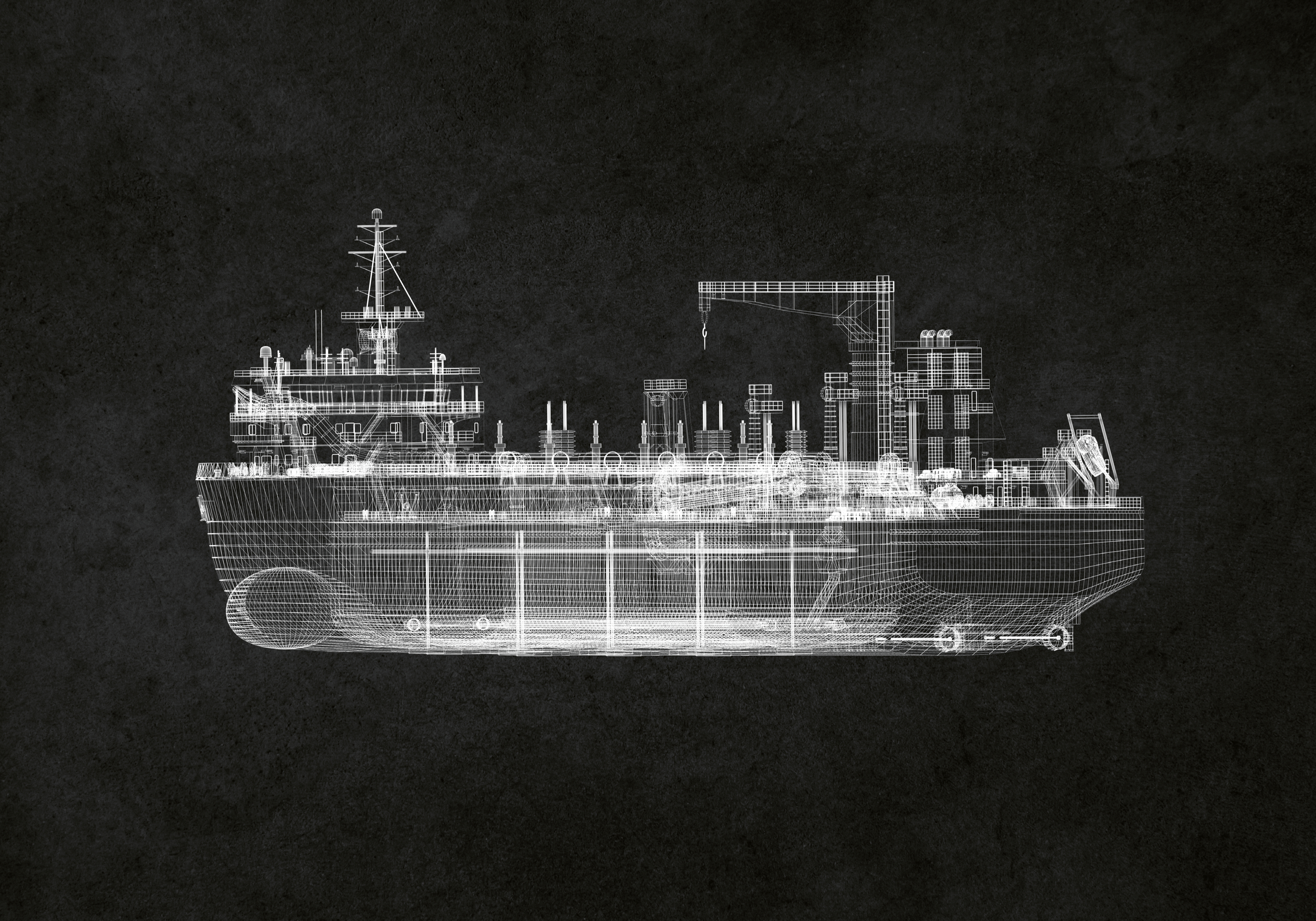 白い線で描かれた大きな船のポスター。暗い背景に浮かび上がる船には、クレーンやアンテナなどの細かい構造が描かれています。幾何学的な形と滑らかな質感が、設計図のような雰囲気を作り出しています。