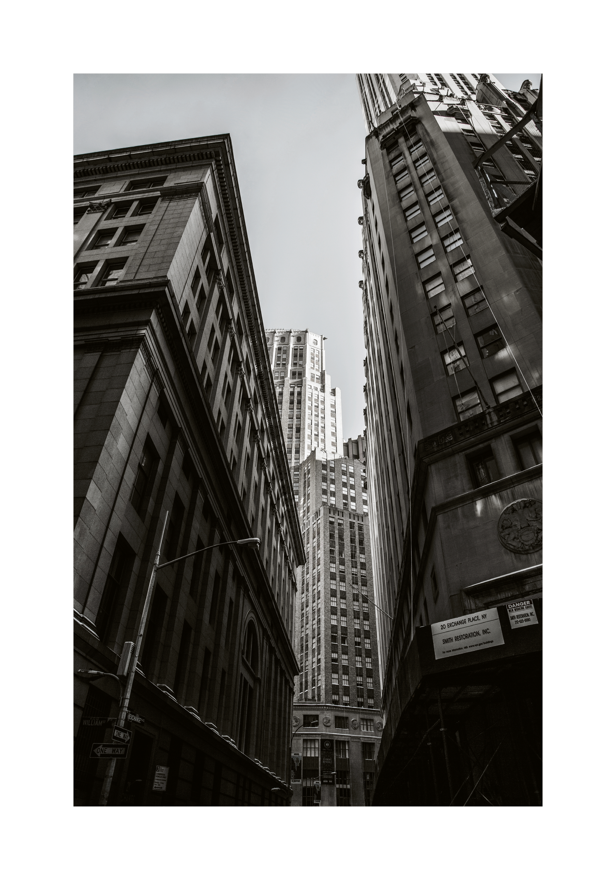 高層ビルが並ぶ街の風景を白黒で表現したポスターです。石やコンクリートの質感が細かく描かれ、窓や街灯が見えます。空に向かって見上げる視点で、建物の高さと迫力を感じられます。
