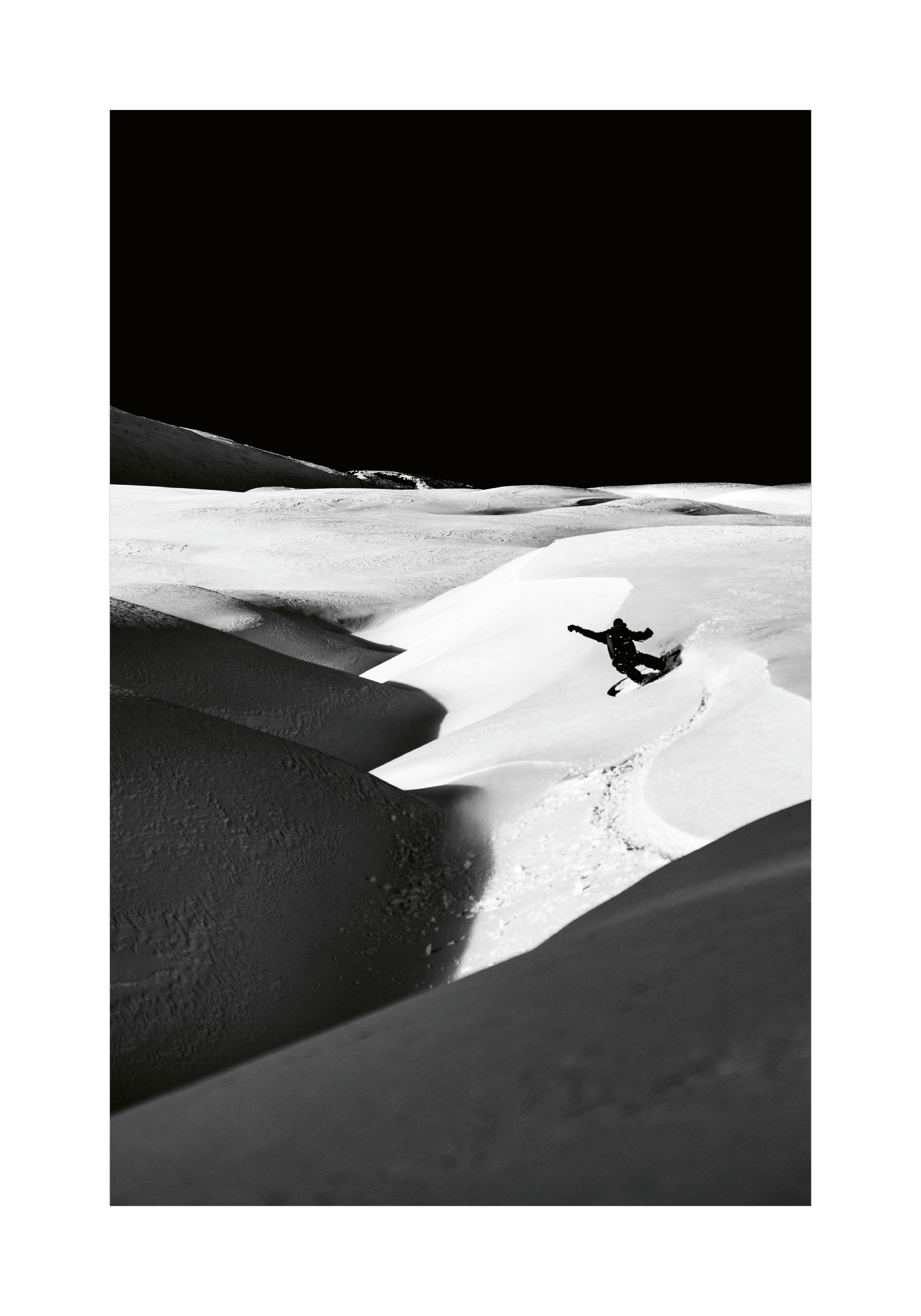 雪の斜面を滑るスノーボーダーのポスター。白と黒のシンプルなデザインで、雪の美しい曲線と影が際立ちます。