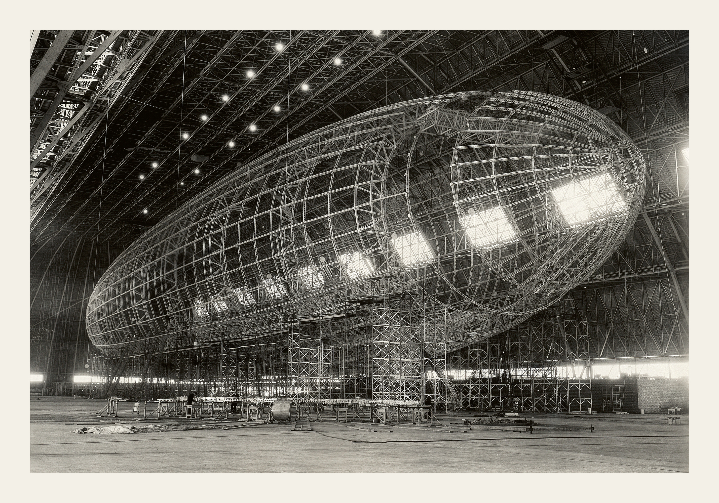大きな飛行船の骨組みが広い格納庫の中にあります。金属の枠組みが美しく、白黒写真が空間の広さを表現しています。
