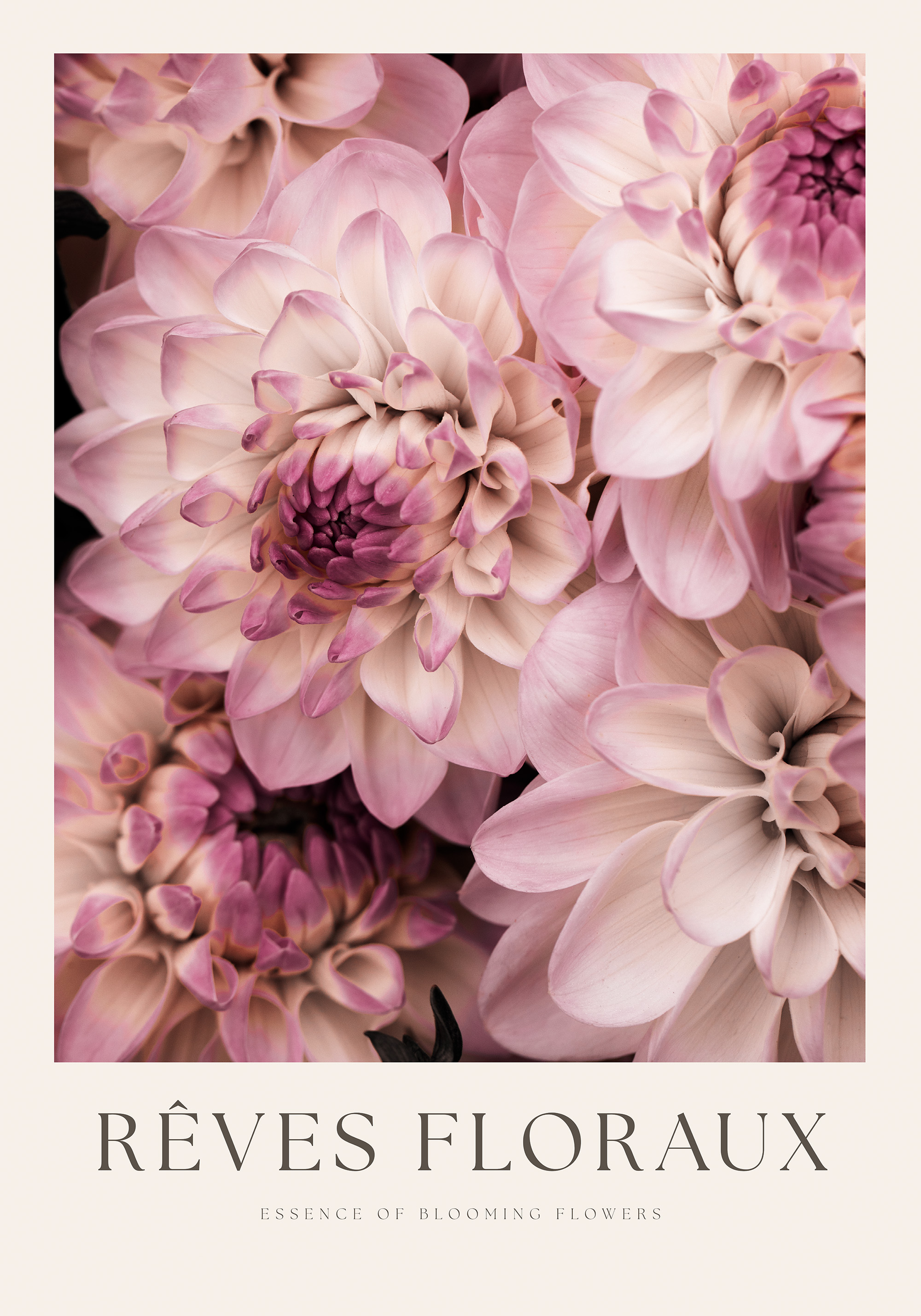 ピンクと白の美しいダリアの花が咲き誇るポスター。やわらかな花びらと深いピンクの中心が、暗い背景に映えて華やかな印象を与えます。お部屋を明るく彩る花のアートです。