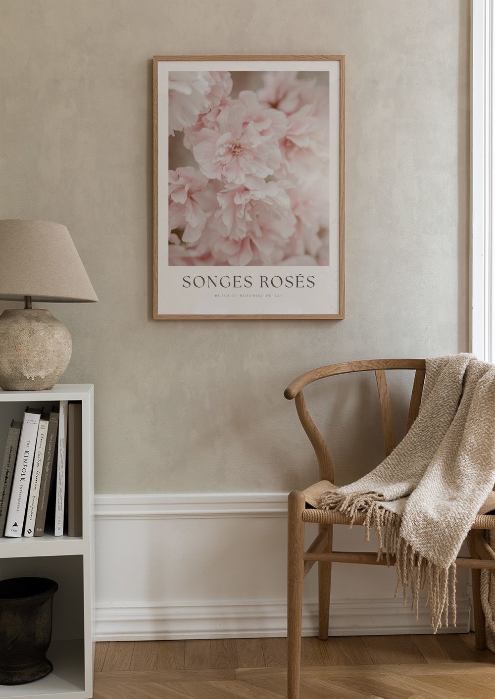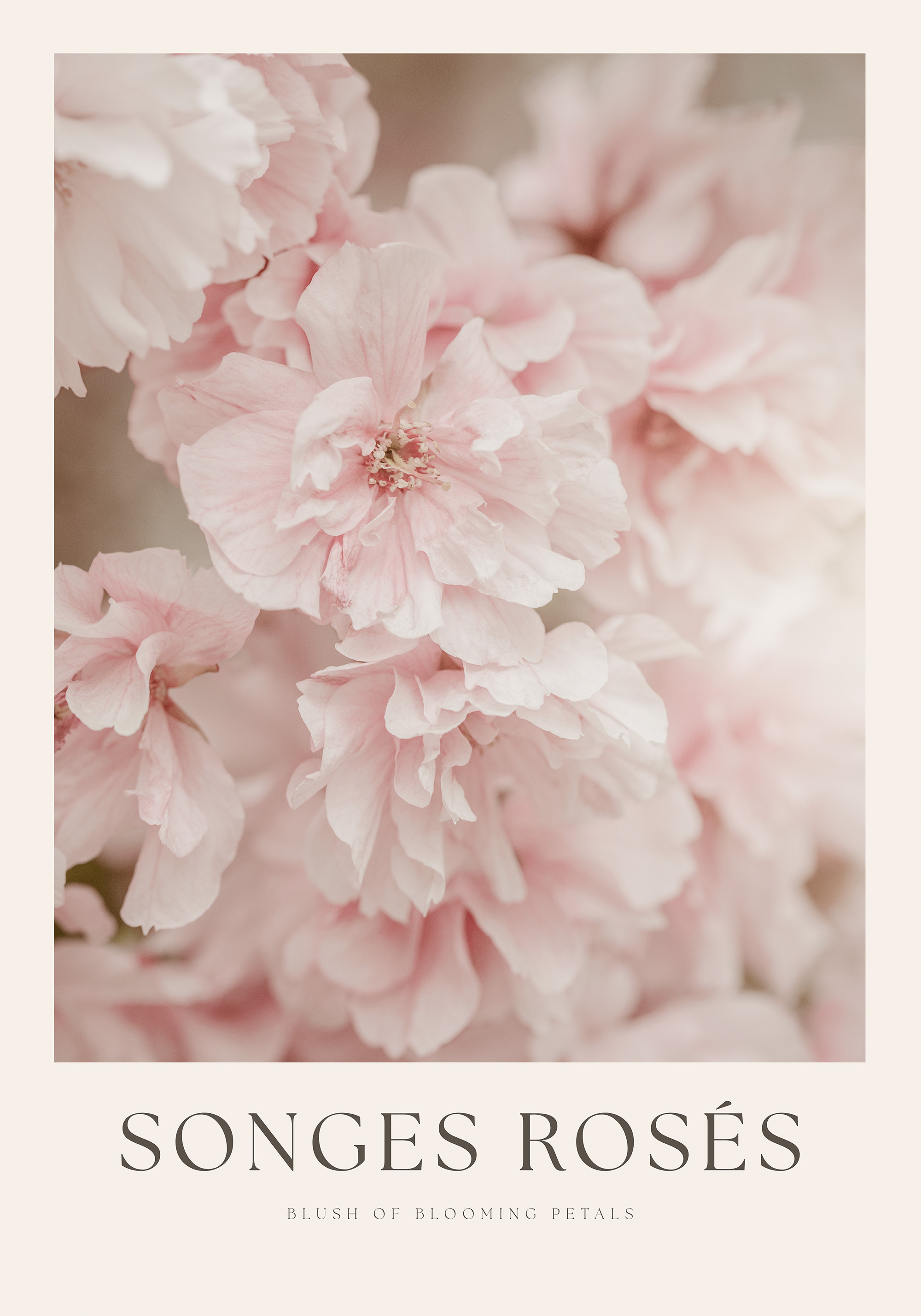 柔らかなピンクのバラが優しく咲く、穏やかなポスター。ふんわりとした花びらが重なり合い、パステルカラーの美しさが際立ちます。お部屋を華やかに彩るアートです。