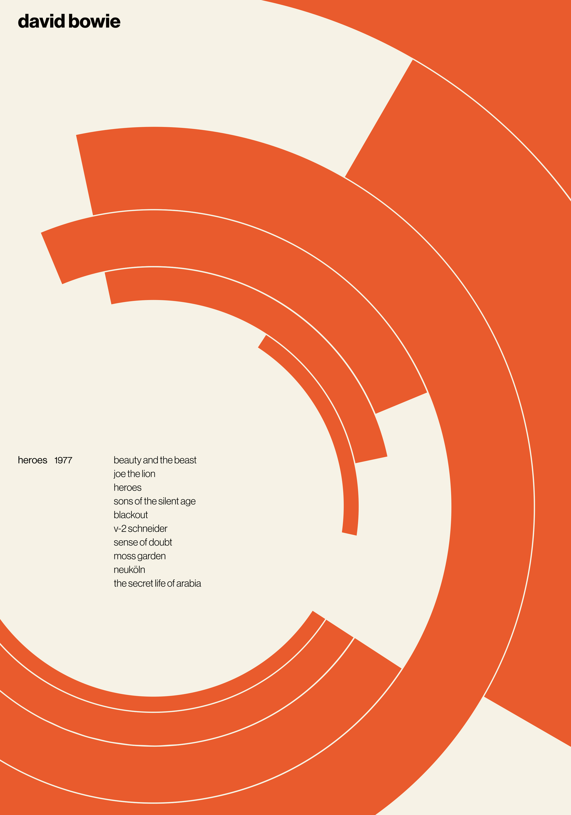 デヴィッド・ボウイの名盤「ヒーローズ」のポスター。クリーム色の背景にオレンジの曲線が特徴的なデザインです。