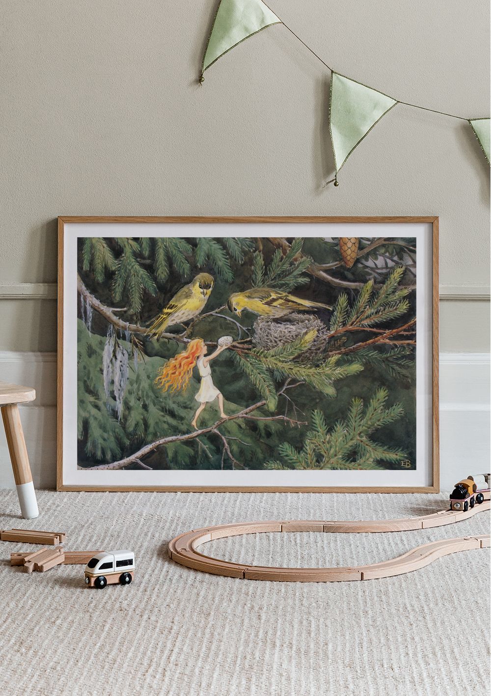 小さな妖精が木の枝に立ち、卵を持っています。黄色い鳥たちが近くにいて、緑の松葉と松ぼっくりが背景を彩ります。温かみのある色合いの、魔法のようなポスターです。
