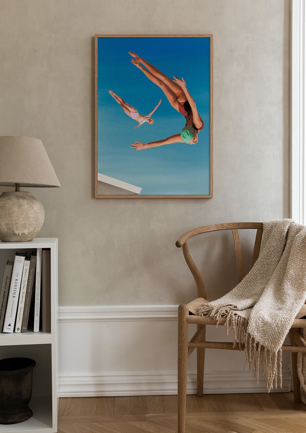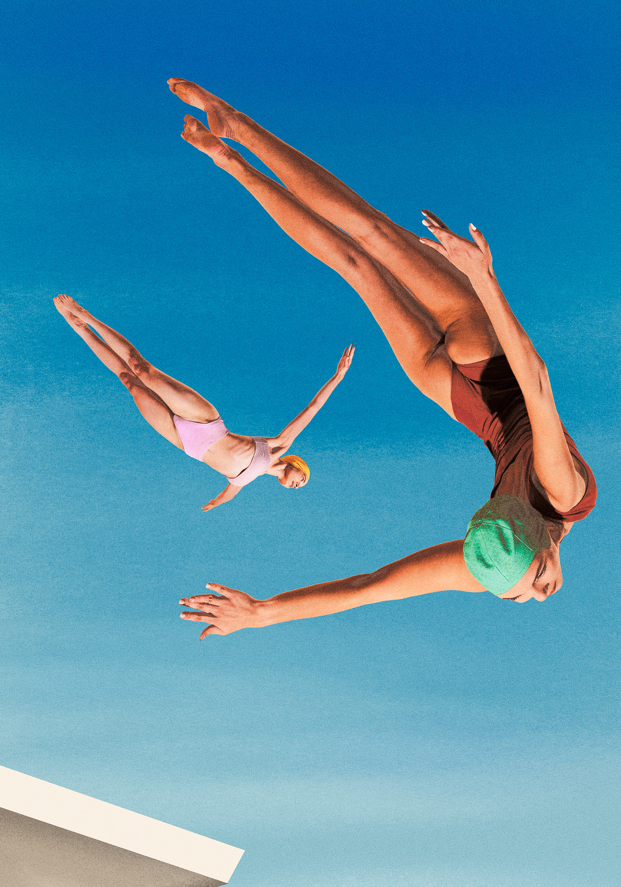 青空に飛び込む2人のダイバーを写した写真ポスター。緑と黄色のキャップが夏らしい爽やかな一枚です。