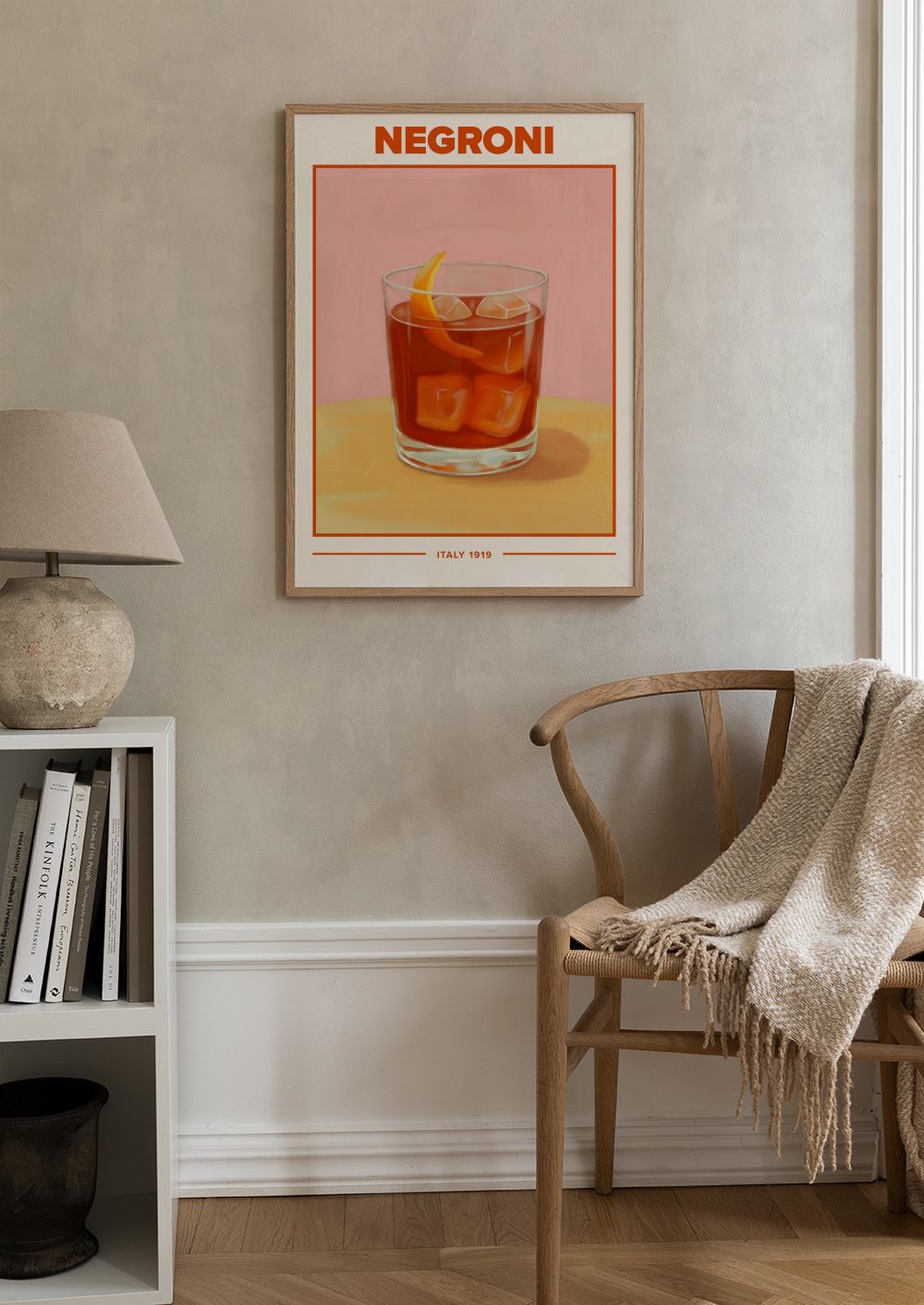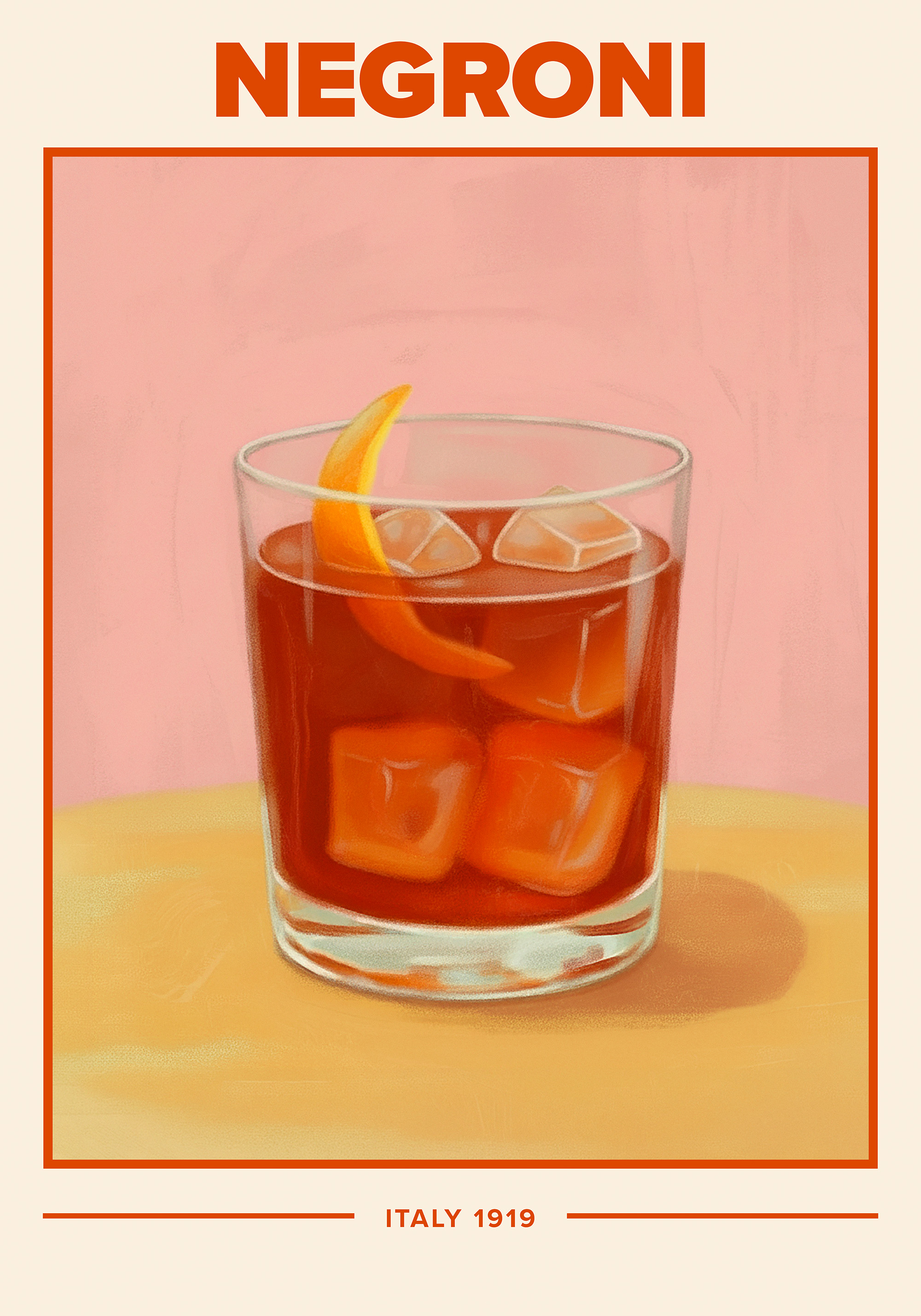 ネグローニカクテルのポスター。オレンジ色の飲み物と氷が入ったグラス。ピンクの背景に「NEGRONI」と「ITALY 1919」の文字。おしゃれなデザインです。
