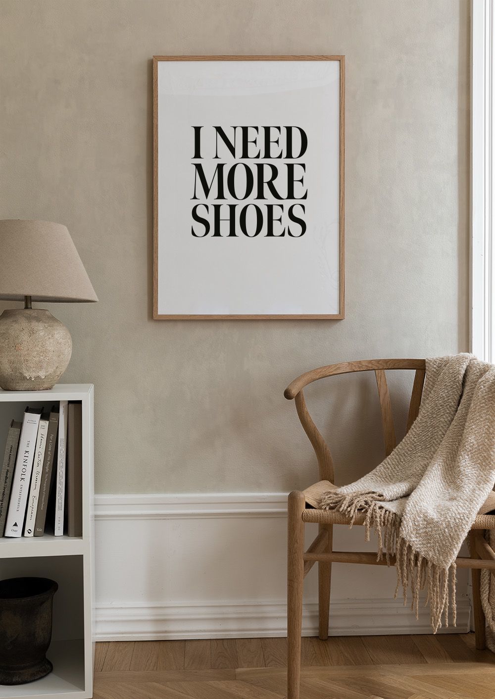 白い背景に黒い文字で「I NEED MORE SHOES」と書かれたシンプルなポスター。靴好きにぴったりのデザインです。
