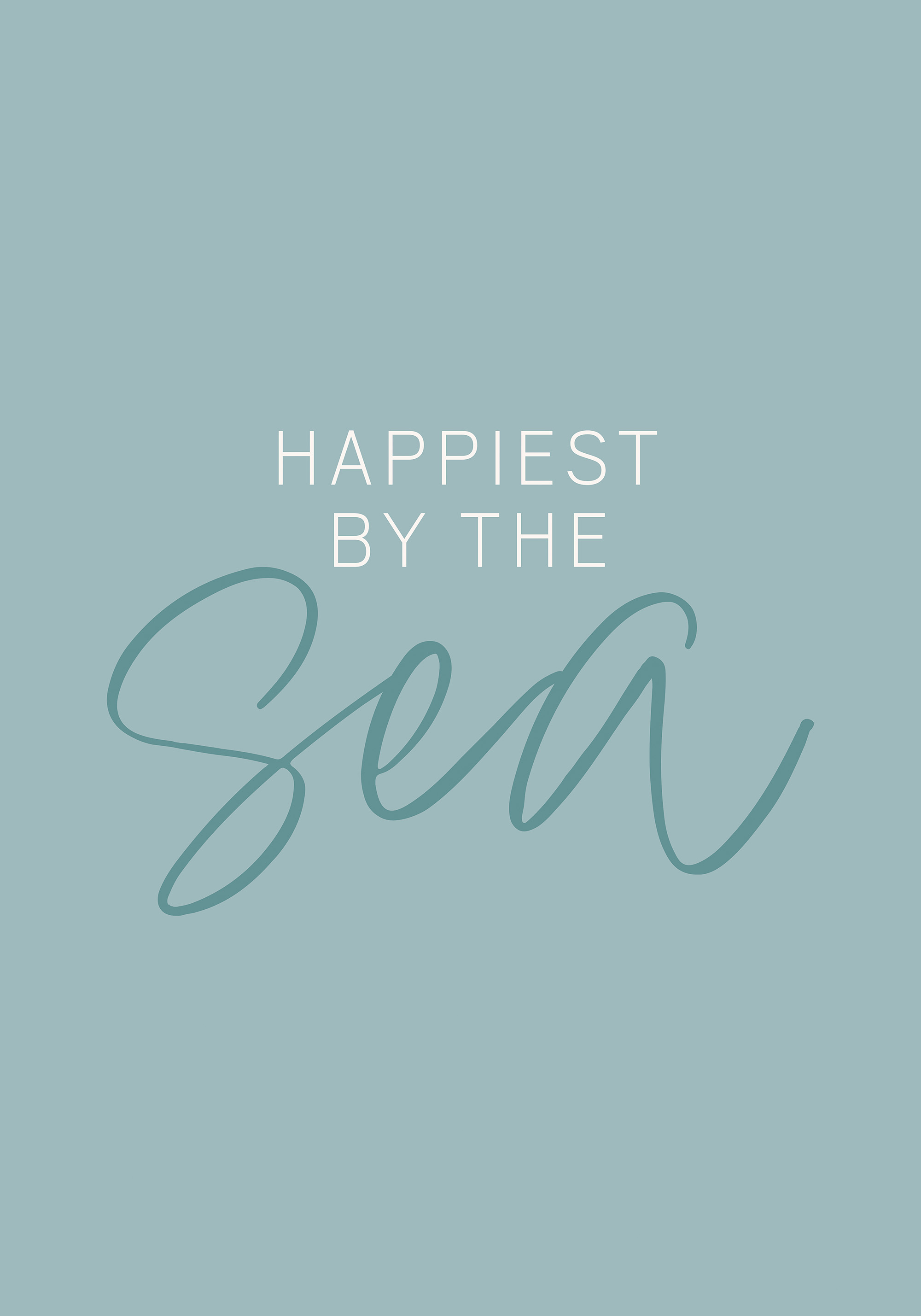 海のそばが一番幸せ。明るい青色の背景に、白と青緑の文字で描かれたシンプルなデザインのポスターです。