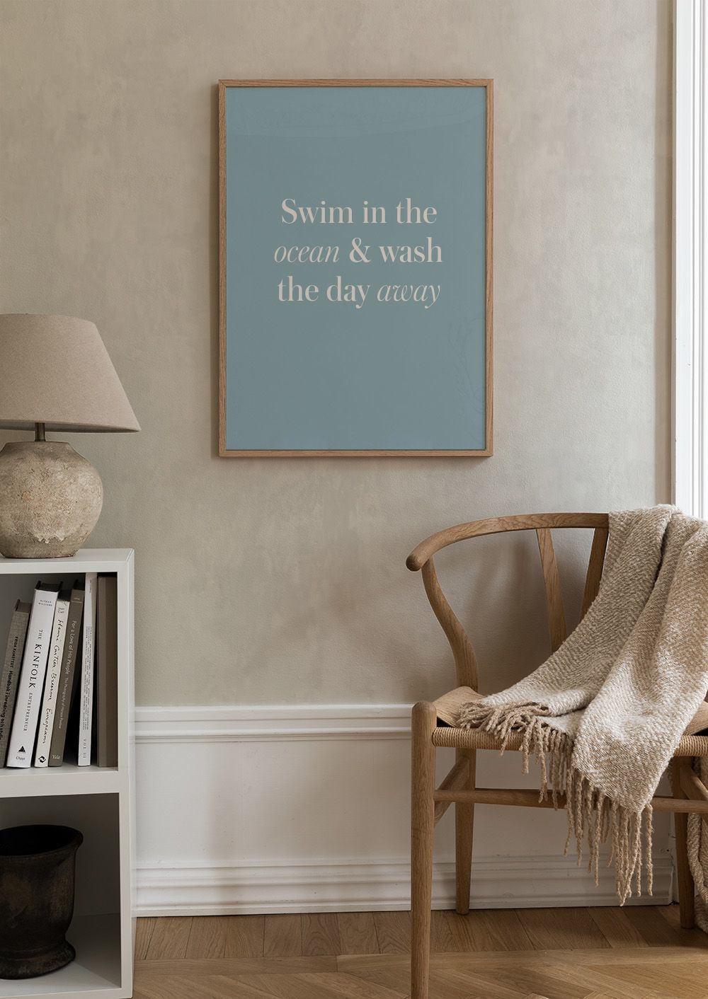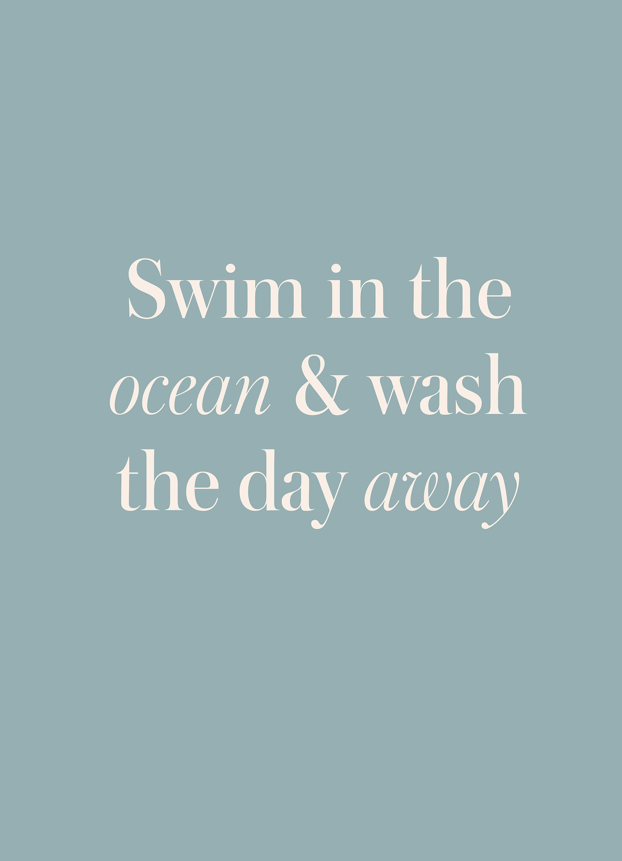 淡いブルーの背景に「海で泳いで、一日の疲れを洗い流そう」という言葉が書かれた、心が落ち着くポスターです。優しい色合いと美しい文字が、お部屋に穏やかな雰囲気をもたらします。
