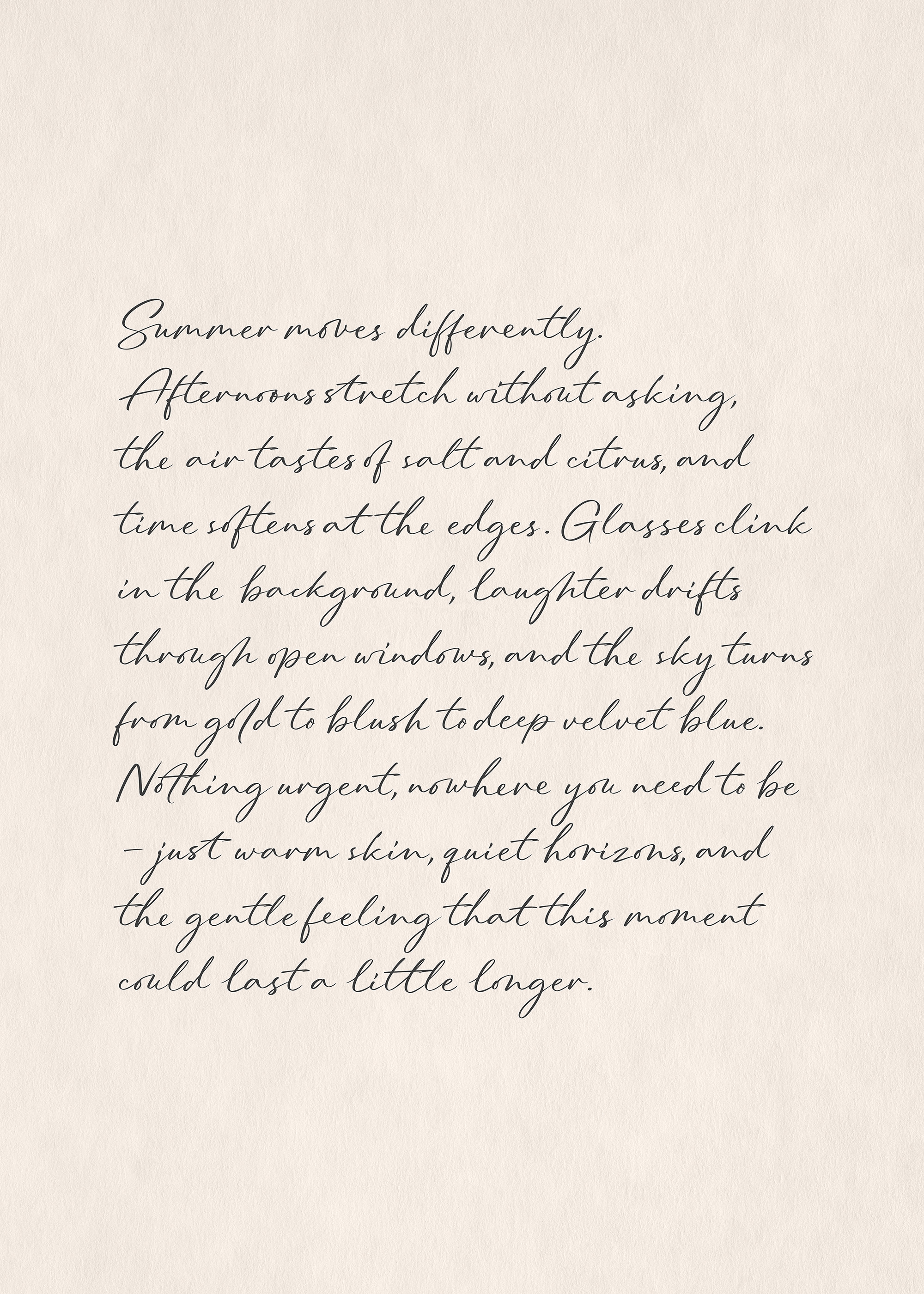 2枚のポスターセット:教会の塔と緑のドームがある海辺の町を描いた水彩画のポスターと、夏についての手書きのテキストが入ったポスター。美しいギャラリーウォールを作るのに最適です。