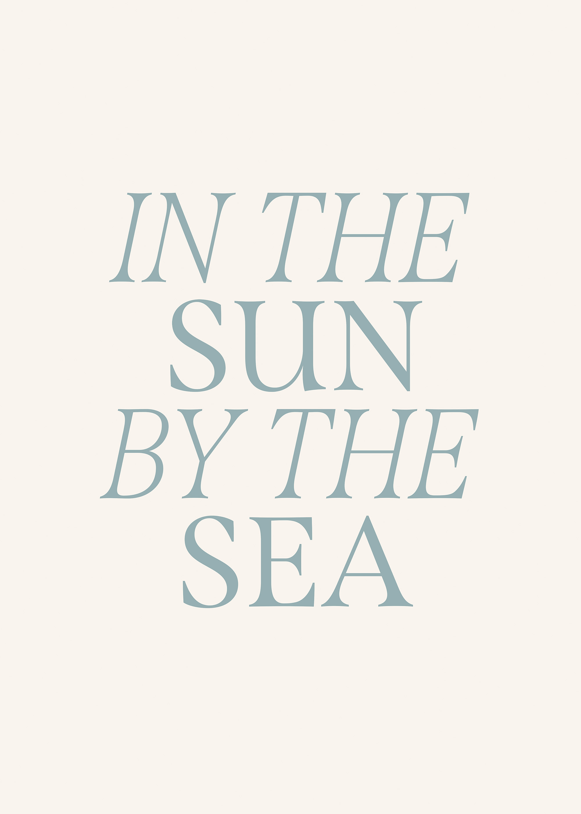 透き通った青い海に傾くヤシの木とロープブランコを描いたポスター。"IN THE SUN BY THE SEA"というテキストが入っています。お部屋にぴったりのトロピカルウォールアートです。