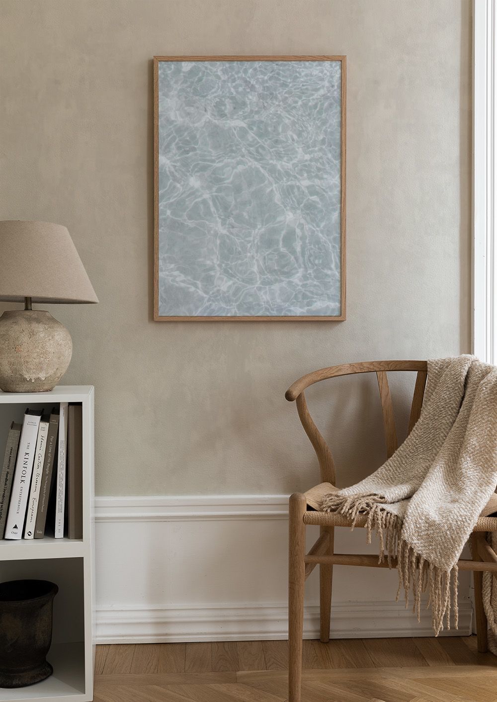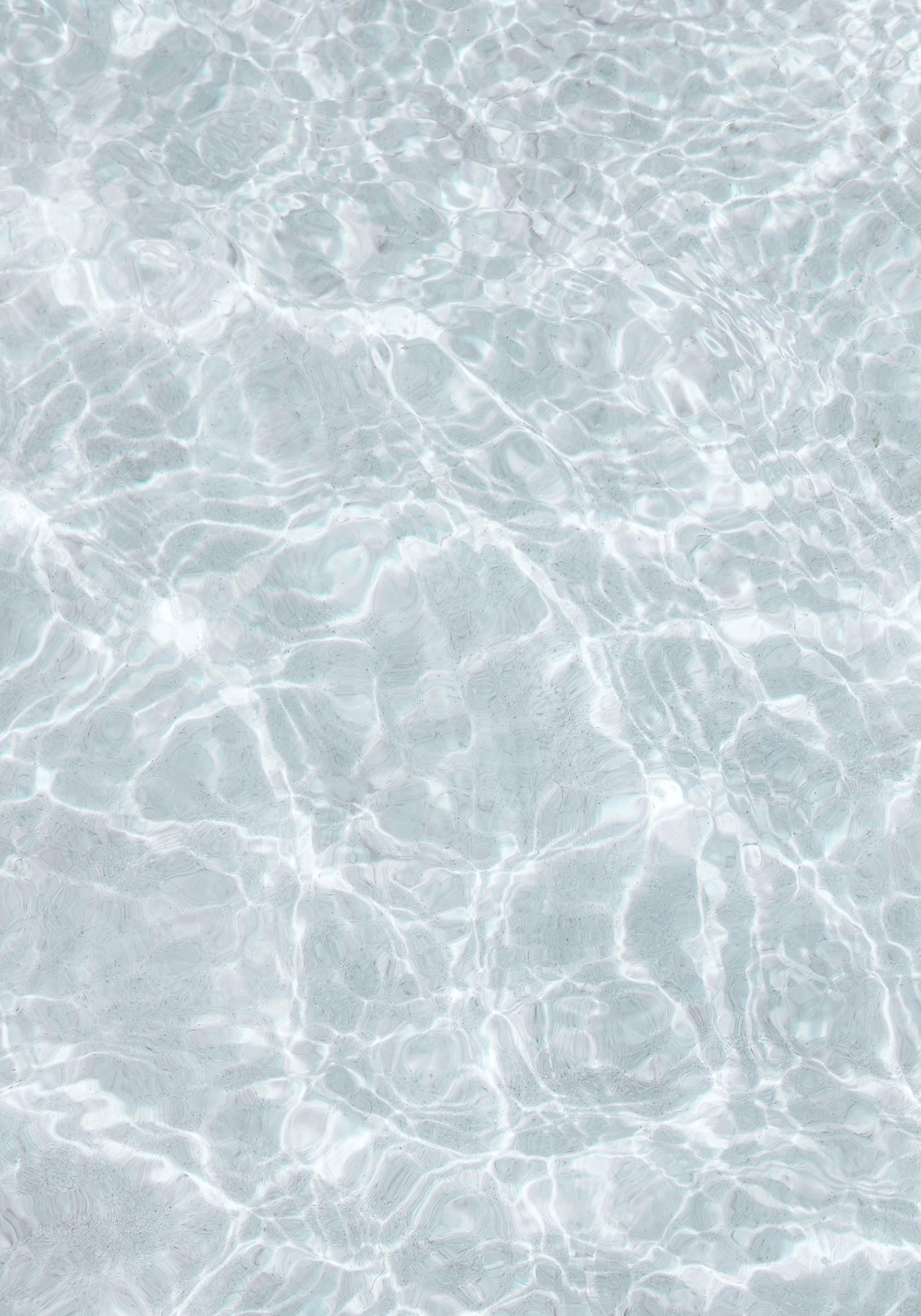 透明な水面に光が反射して、美しい波模様を作り出しています。淡い青と白の色合いが、爽やかで穏やかな雰囲気を演出。プールや静かな海のような、清らかで心安らぐポスターです。