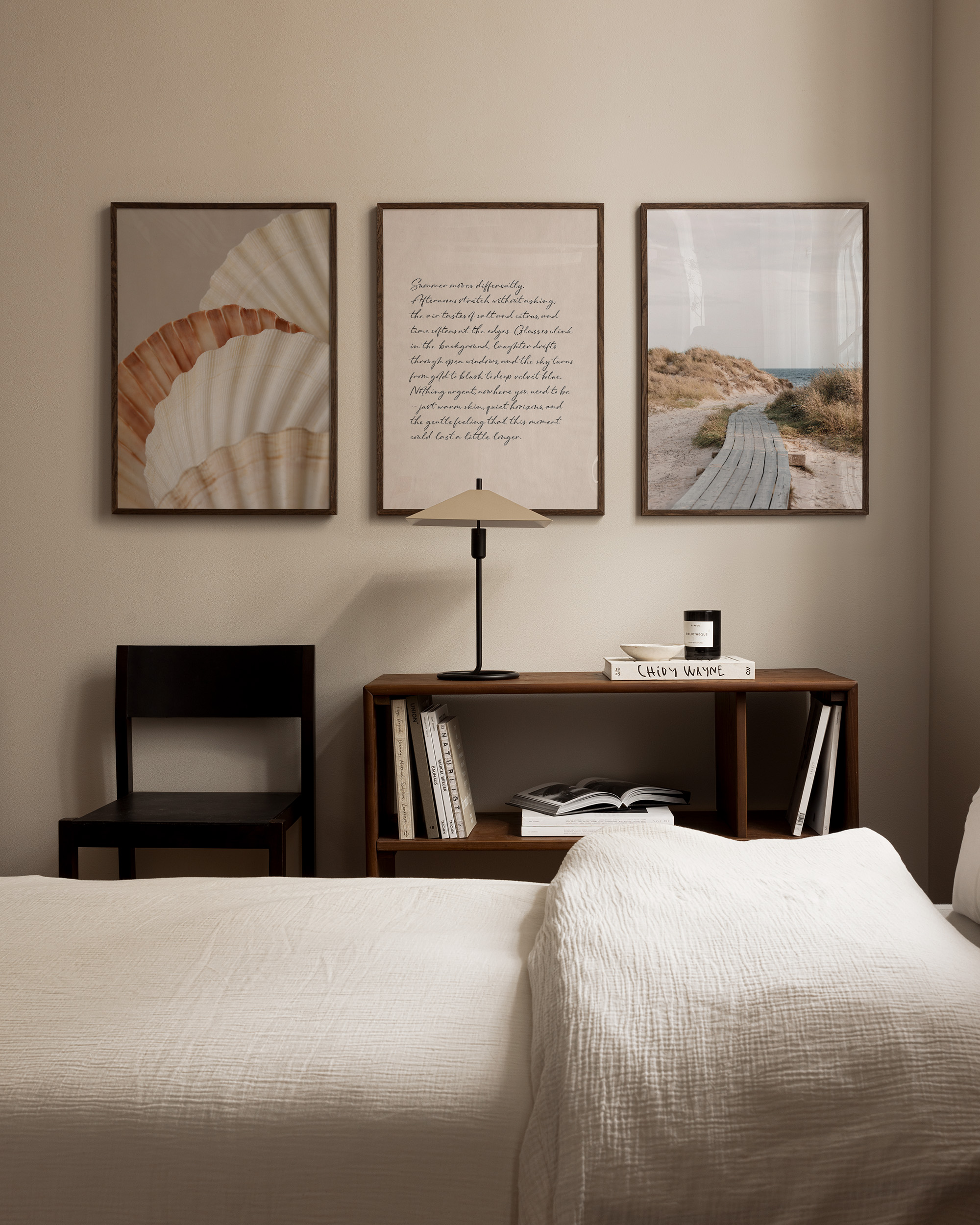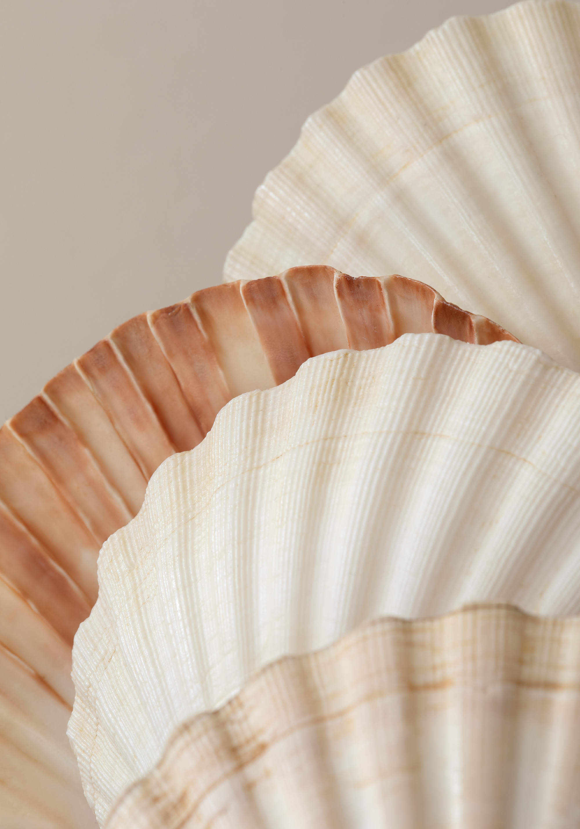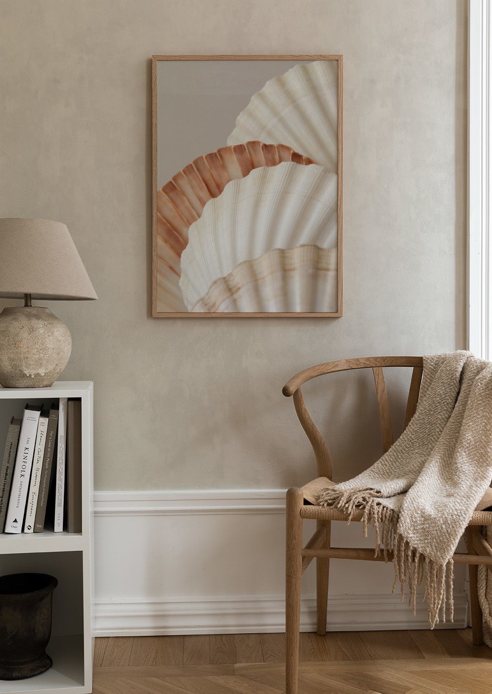 柔らかな白からベージュ、ピンクがかった茶色の貝殻が重なり合うポスター。波打つ質感と優しい色合いが、穏やかな海辺の雰囲気を演出します。