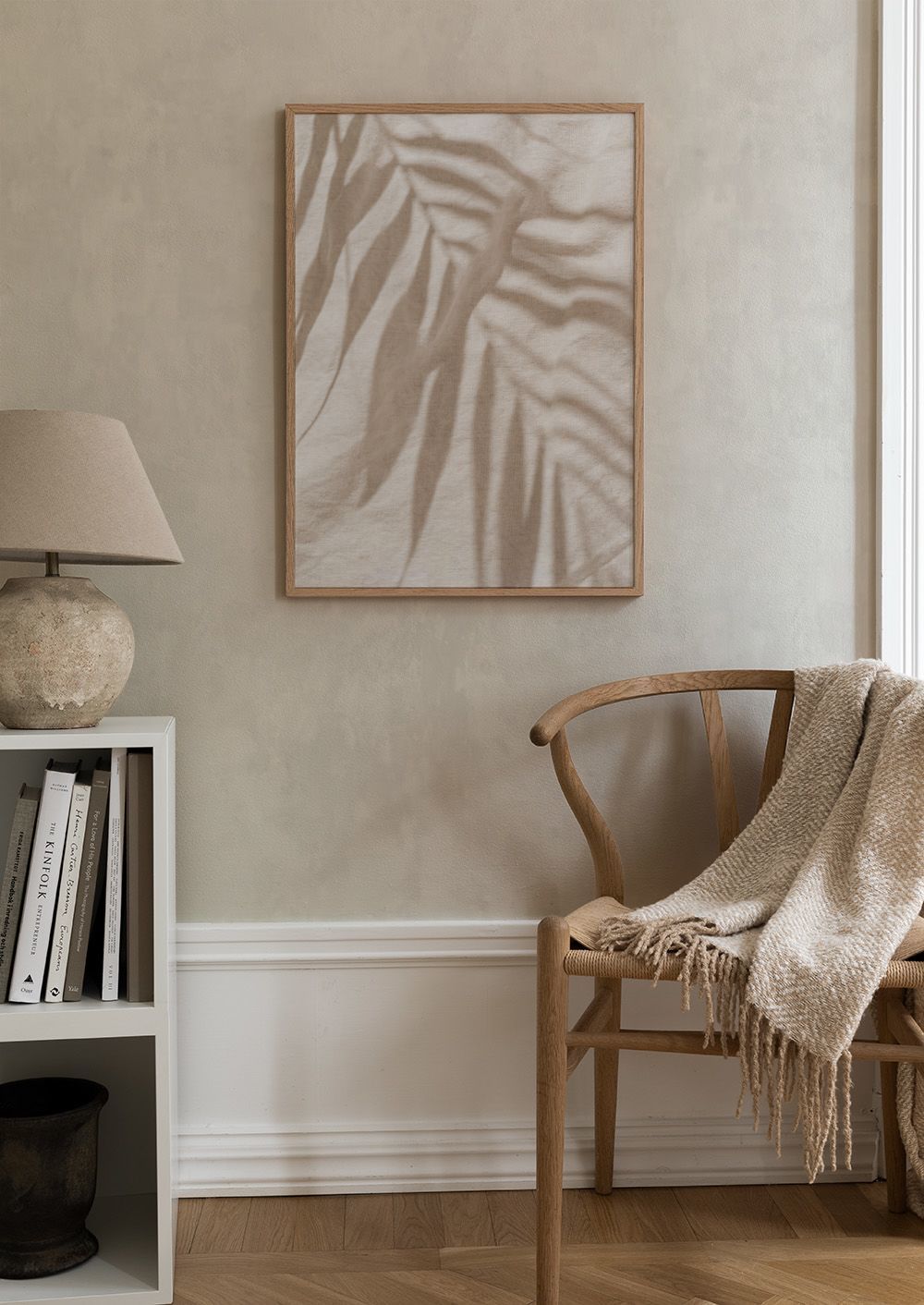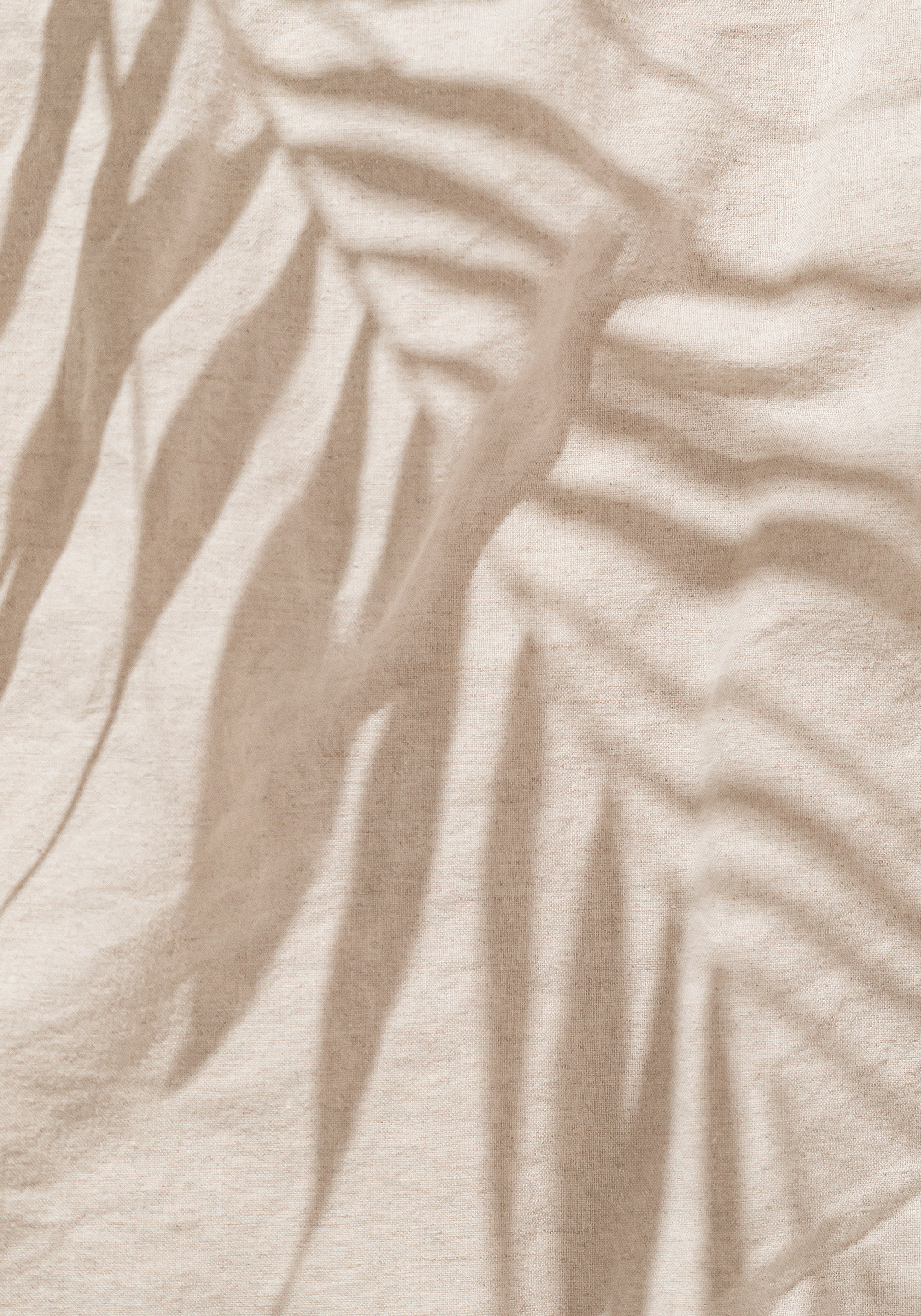 柔らかな葉の影がベージュの布に落ちています。温かみのある自然な雰囲気のポスターです。