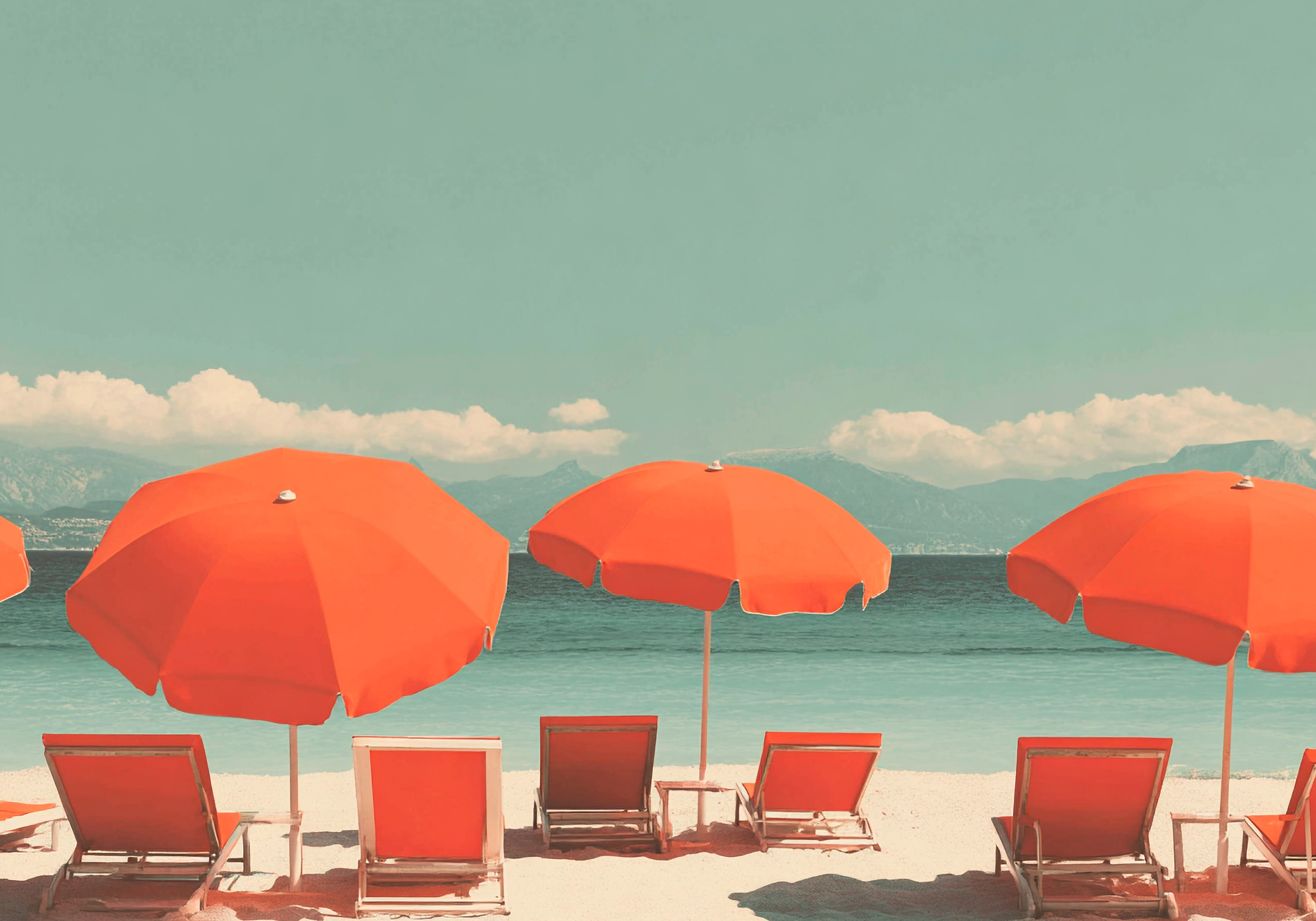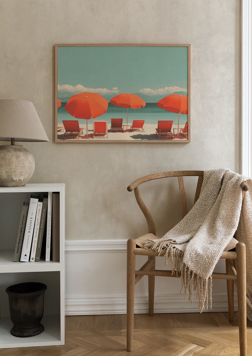 静かな青い海と砂浜に並ぶ、鮮やかなオレンジ色のビーチパラソルとチェア。遠くに山並みが見える、穏やかで温かいビーチの風景ポスターです。
