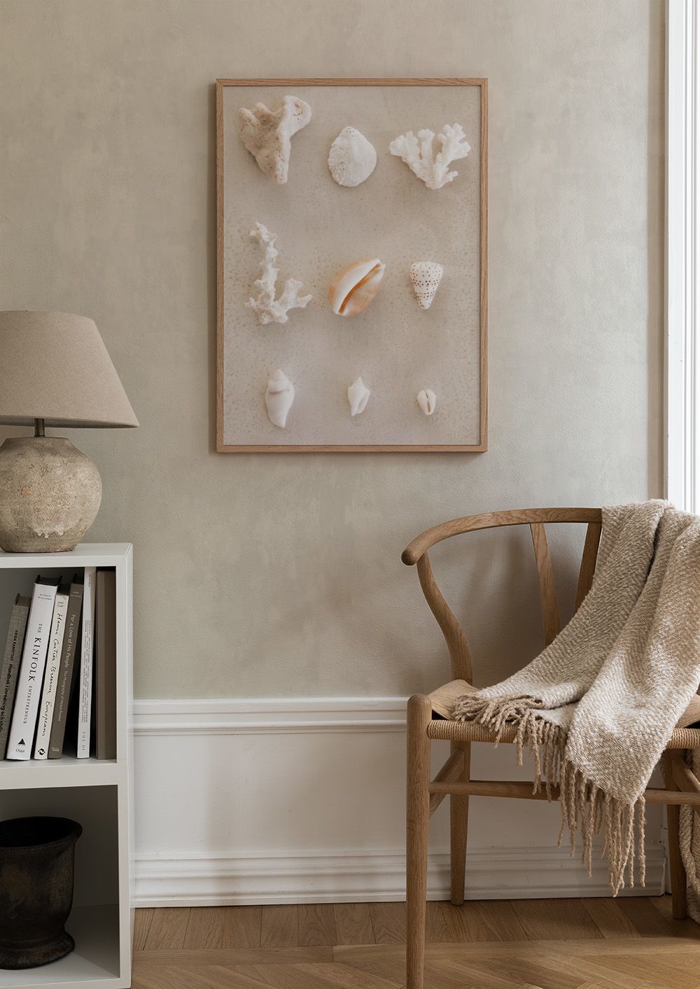美しい貝殻とサンゴのコレクション。白い貝、茶色の貝、サンゴが並んでいます。海の宝物のようなポスターです。