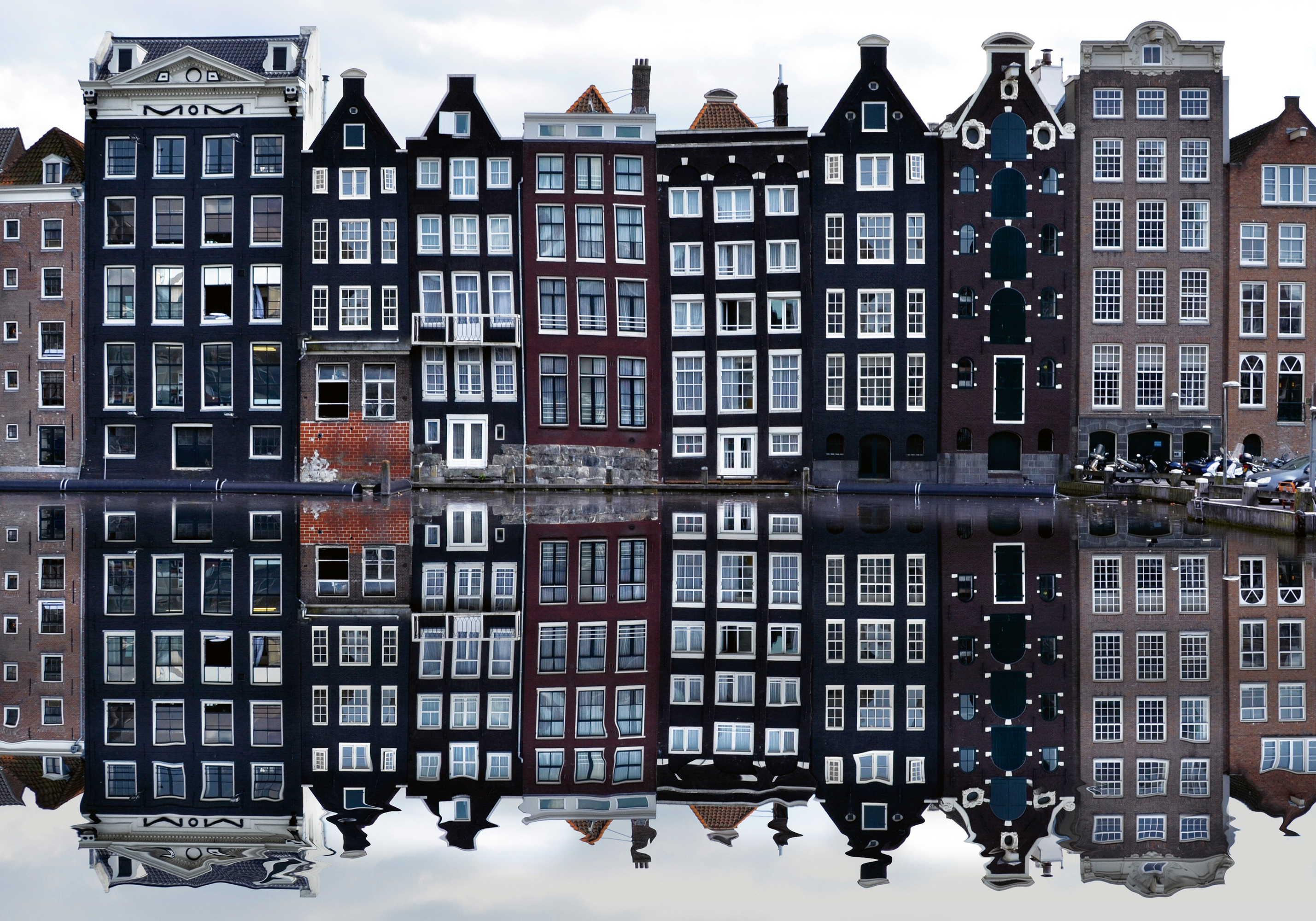 アムステルダムの美しい運河沿いの家々を描いたポスターです。黒、赤、茶色の細長い建物が水面に映り込み、静かで美しい風景を作り出しています。
