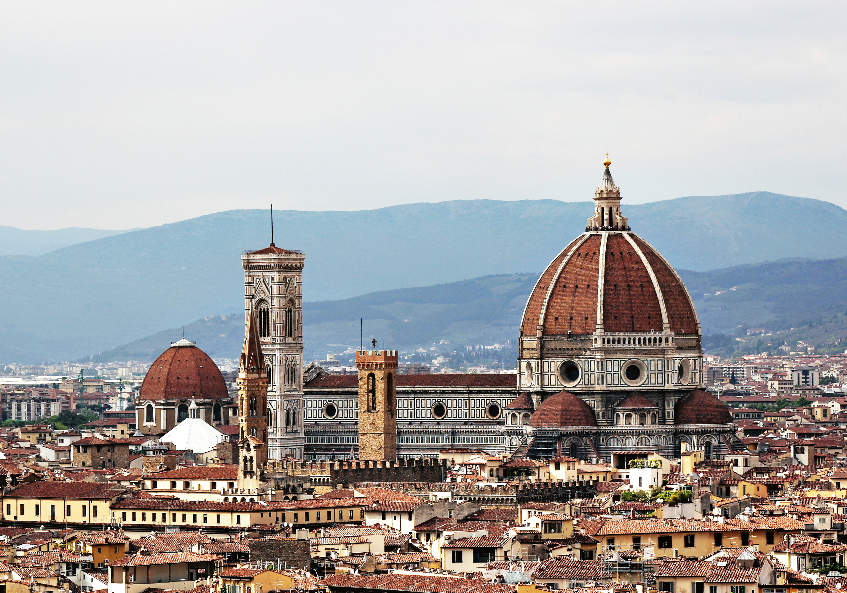 赤い屋根のドーム型大聖堂と高い鐘楼が街を見下ろします。山々を背景に、茶色とグレーの建物が広がる美しい景色のポスターです。