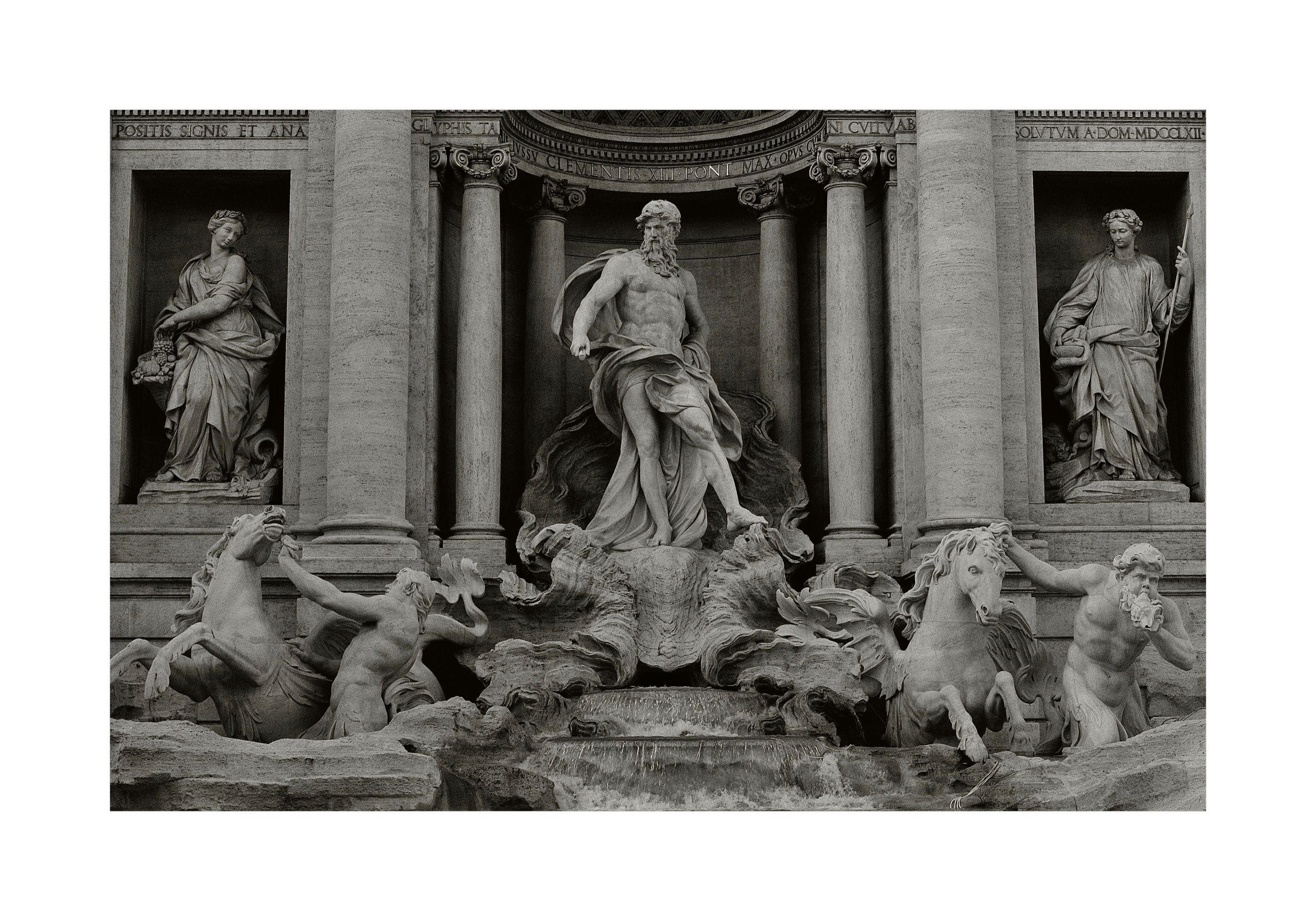 壮大な石の噴水と彫像を描いた白黒アートポスター。中央には髭を生やした男性像、両脇には馬と力強い人物像が配置されています。