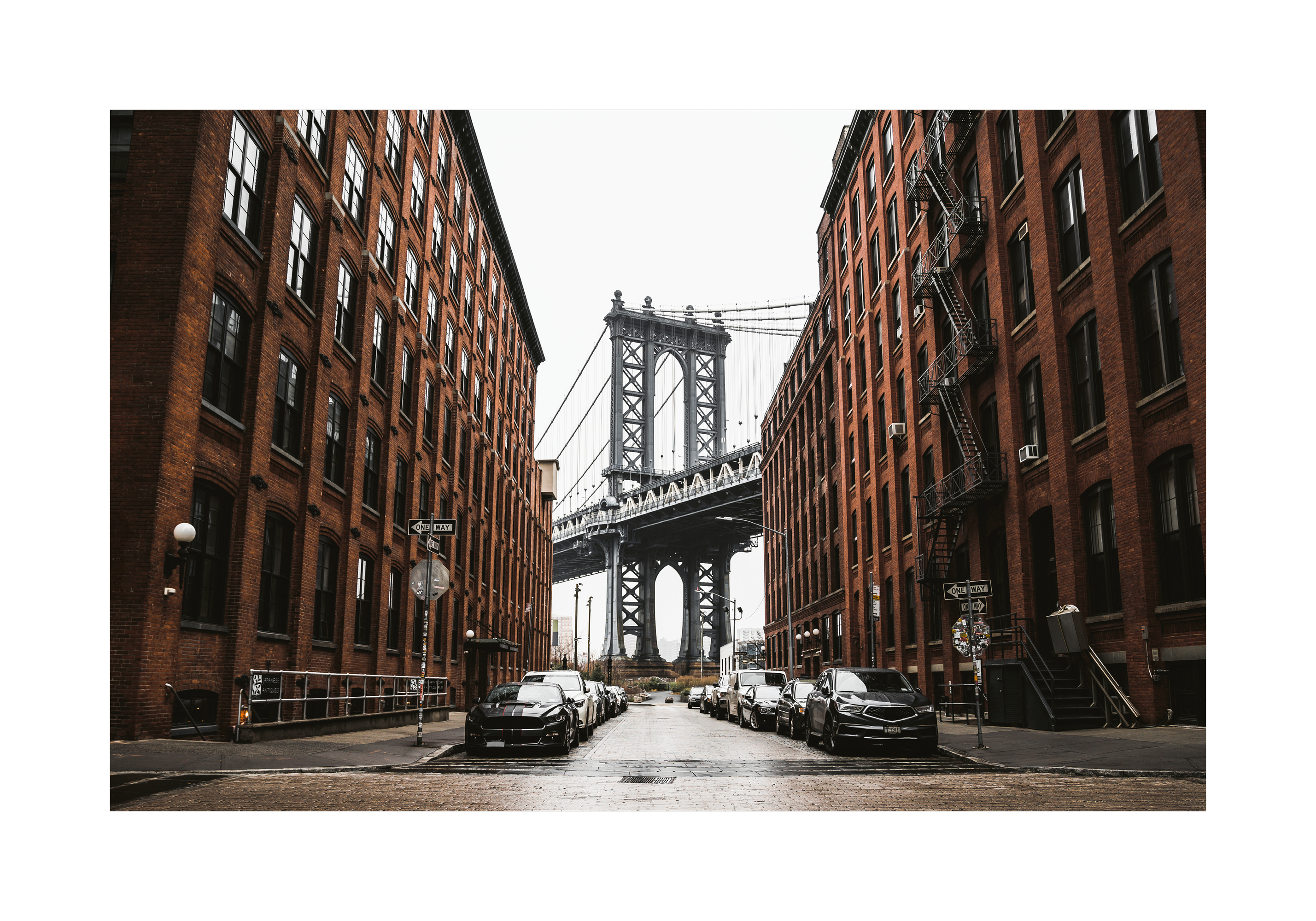 赤レンガの建物が並ぶ、静かな街の風景ポスター。奥には大きな橋が見えます。落ち着いた雰囲気のアート作品です。