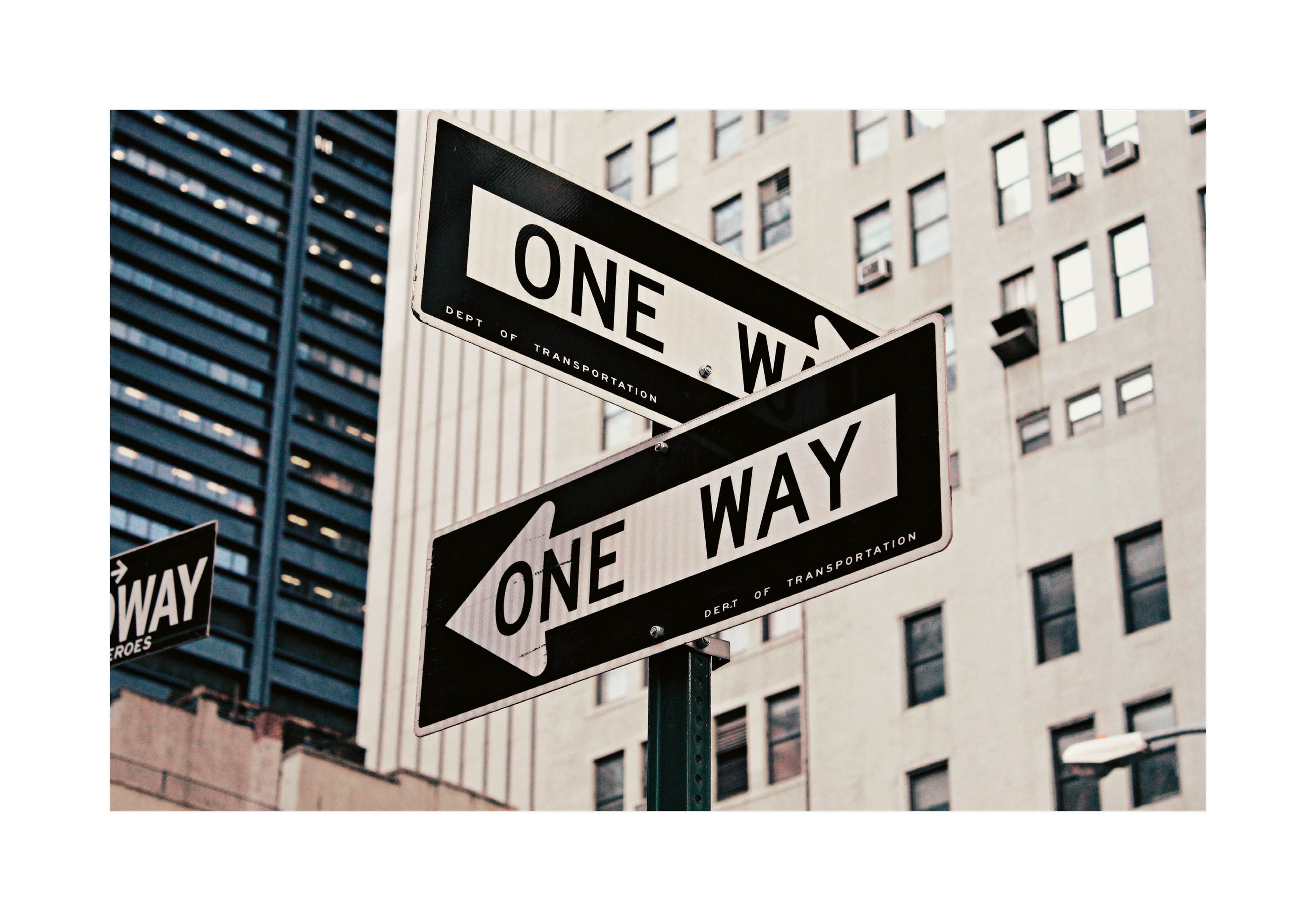 白と黒の「一方通行」の標識が反対方向を指す、都会的なポスター。高層ビルと直線が織りなす、シンプルでクールな街の風景です。