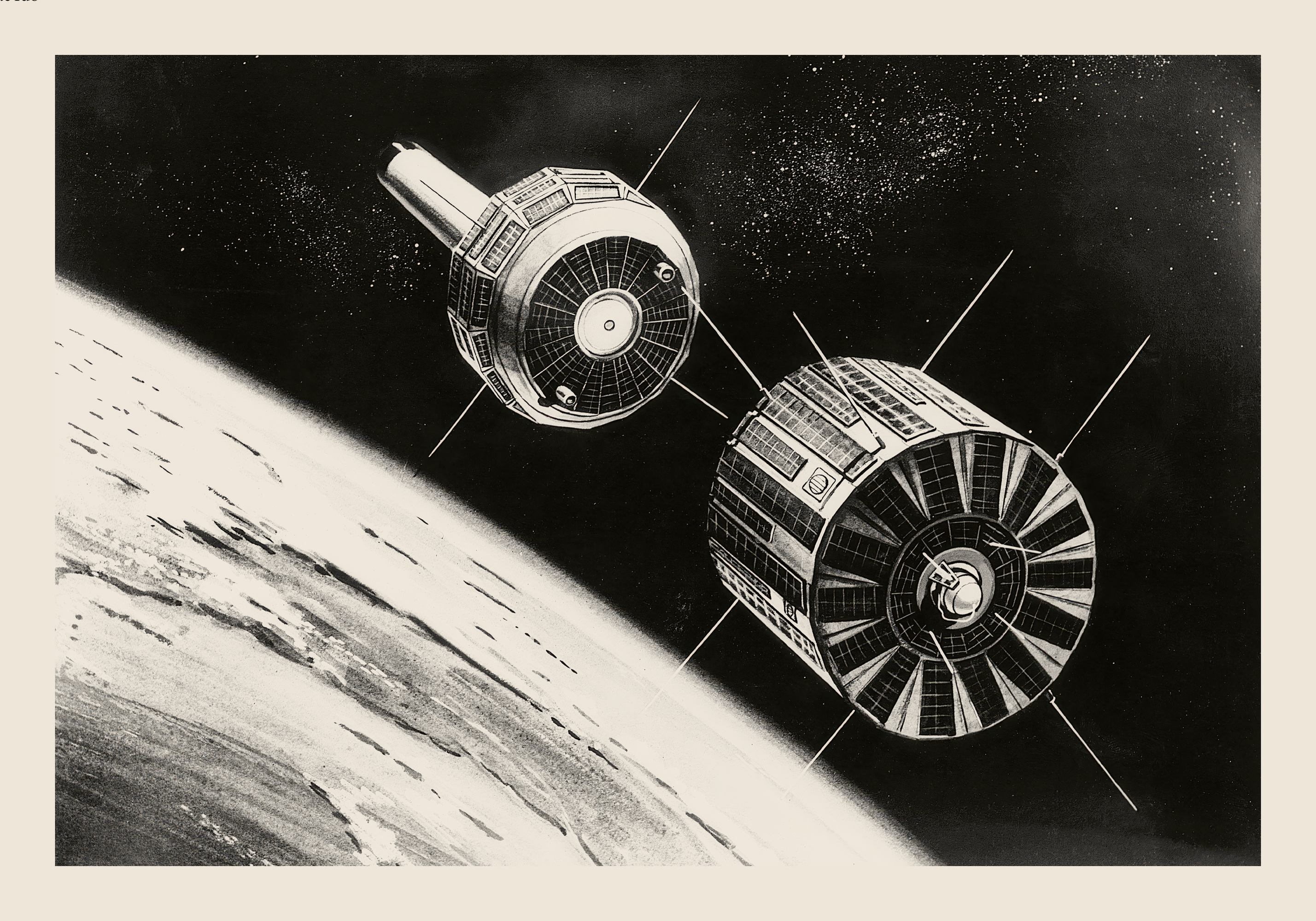 地球の上を浮かぶ宇宙カプセルのポスター。白黒で描かれた美しい宇宙の景色が、お部屋に特別な雰囲気を作ります。星空と地球が見える、シンプルでかっこいいデザインです。