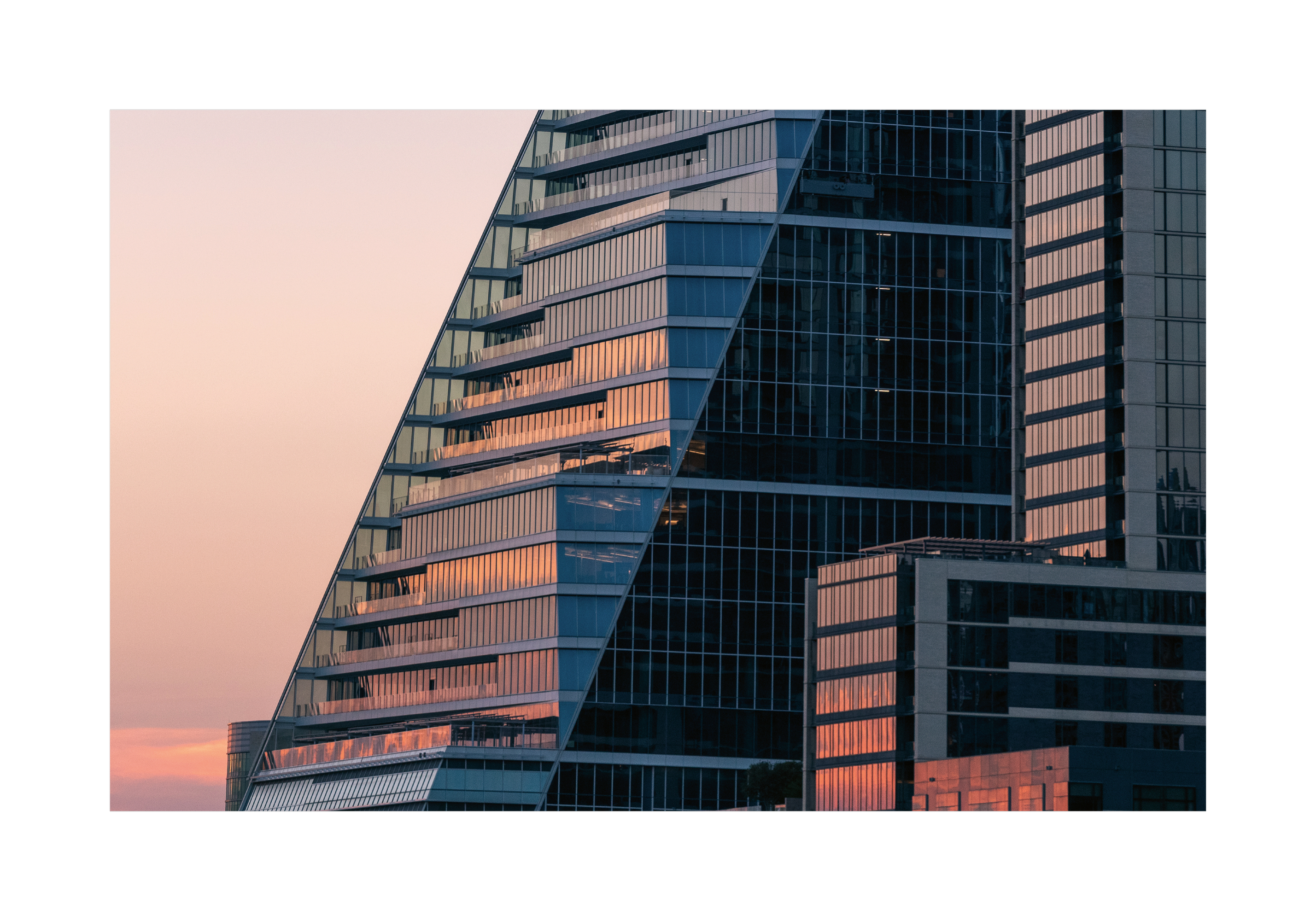 高いガラスのビルが並ぶモダンなポスターです。夕焼けのオレンジとピンクが窓に映り込み、青とグレーのビルを温かく照らします。都会的でおしゃれなデザインがお部屋を明るくします。