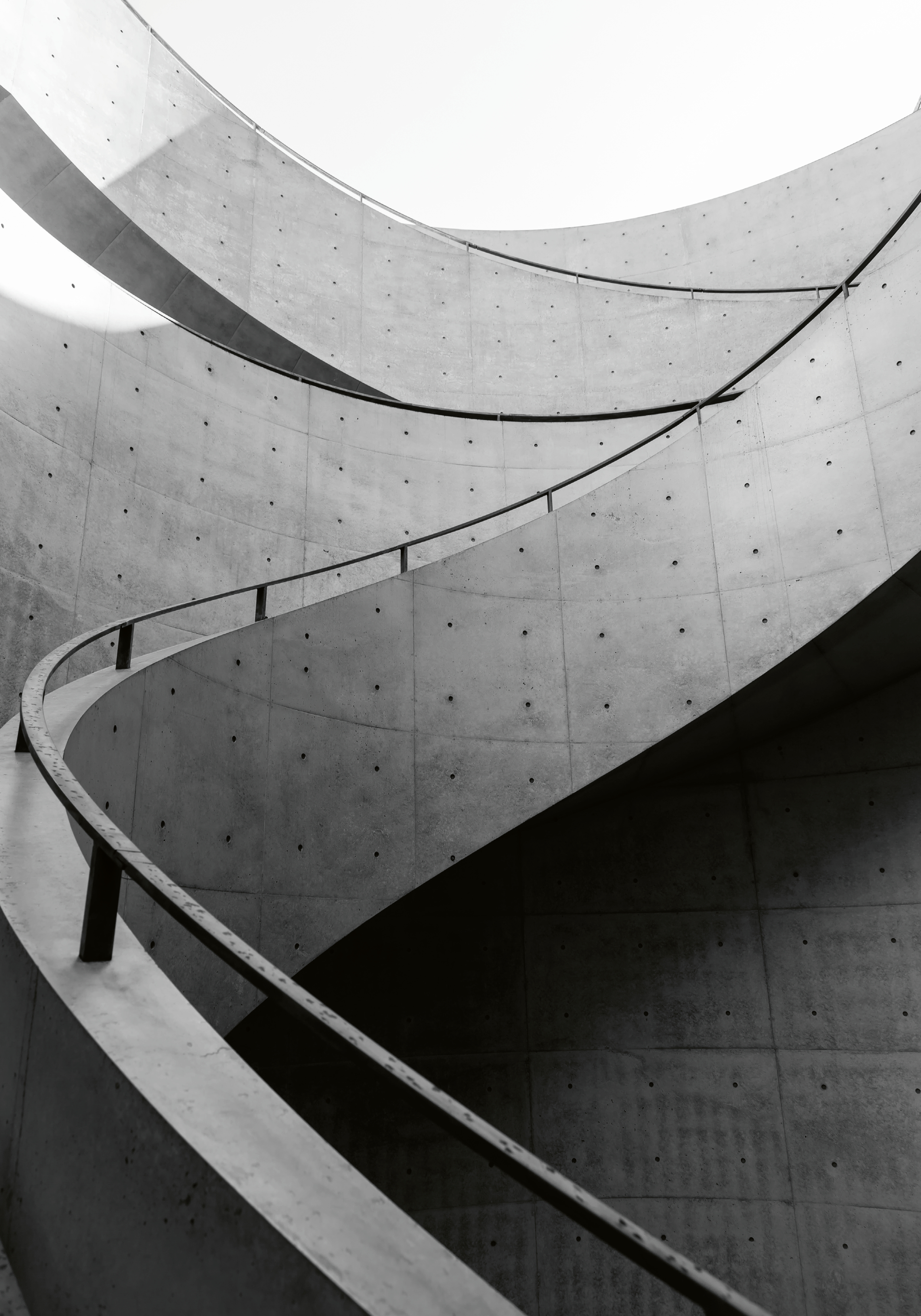 曲線を描くコンクリートの壁と滑らかな手すりが美しいモダンなデザイン。白黒の写真が建築の流れるような動きを際立たせるポスターです。