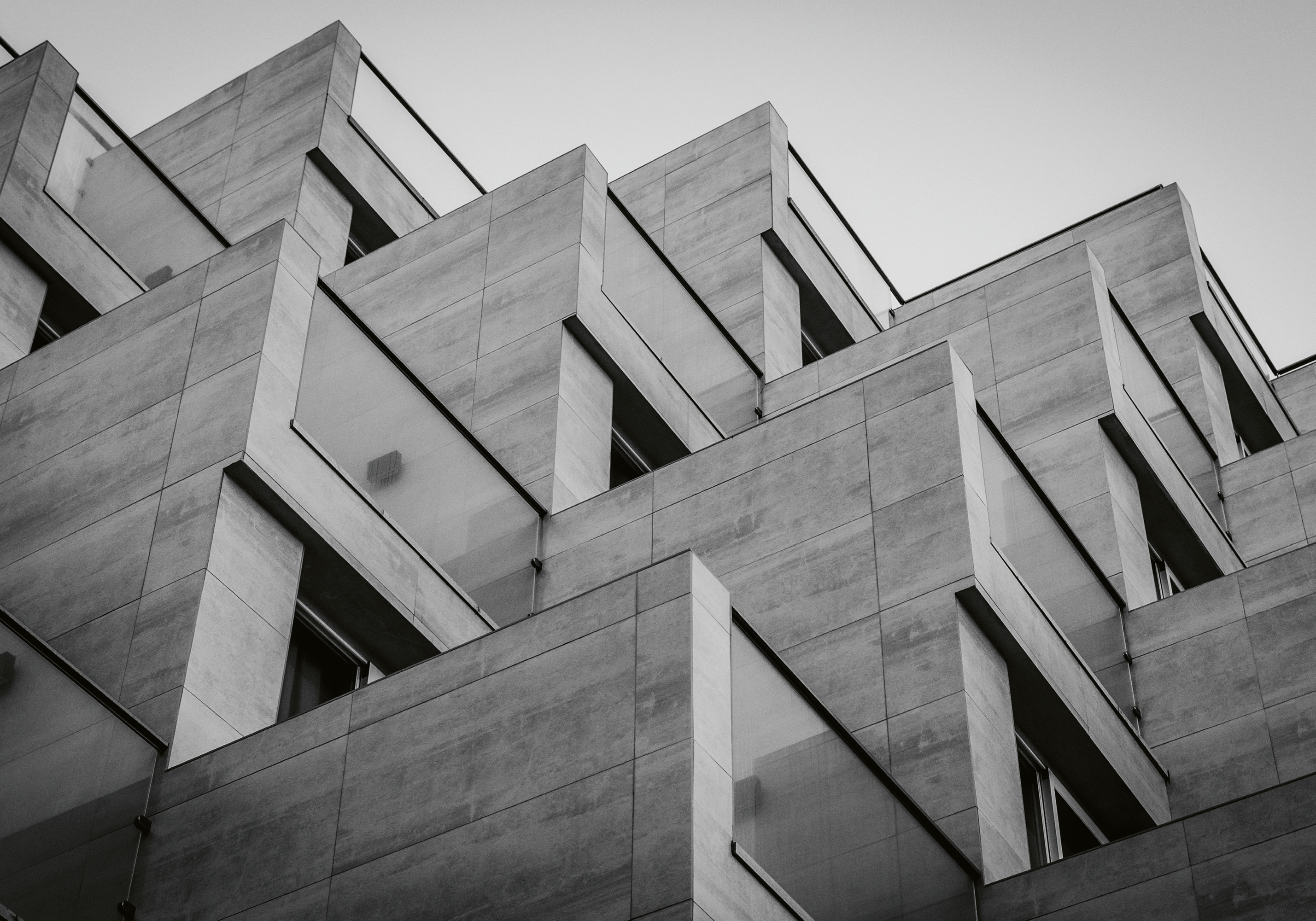 鋭い角度と幾何学的な形が特徴的な、モダンな建物の白黒ポスターです。滑らかなコンクリートの質感とガラスパネルが、建築の美しさを際立たせます。下から見上げる視点が、高さと奥行きを感じさせ、空間に洗練された雰囲気をもたらします。