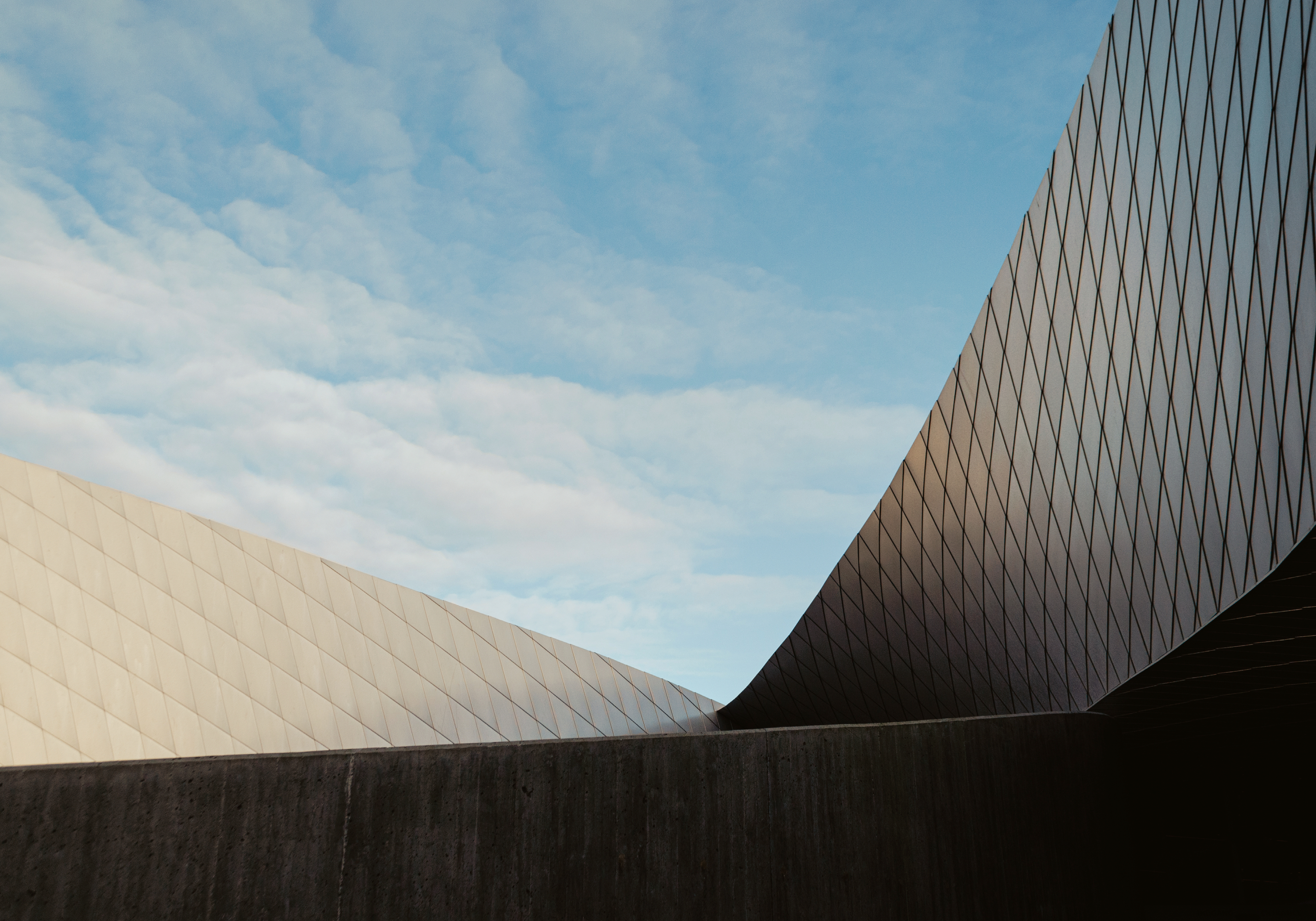 青い空と白い雲を背景に、曲線を描く2つの建築構造物が美しく映えるポスターです。明るい色と暗い色のコントラストが印象的で、格子模様が特徴的なデザインです。シンプルで落ち着いた雰囲気が、お部屋に洗練された印象を与えます。