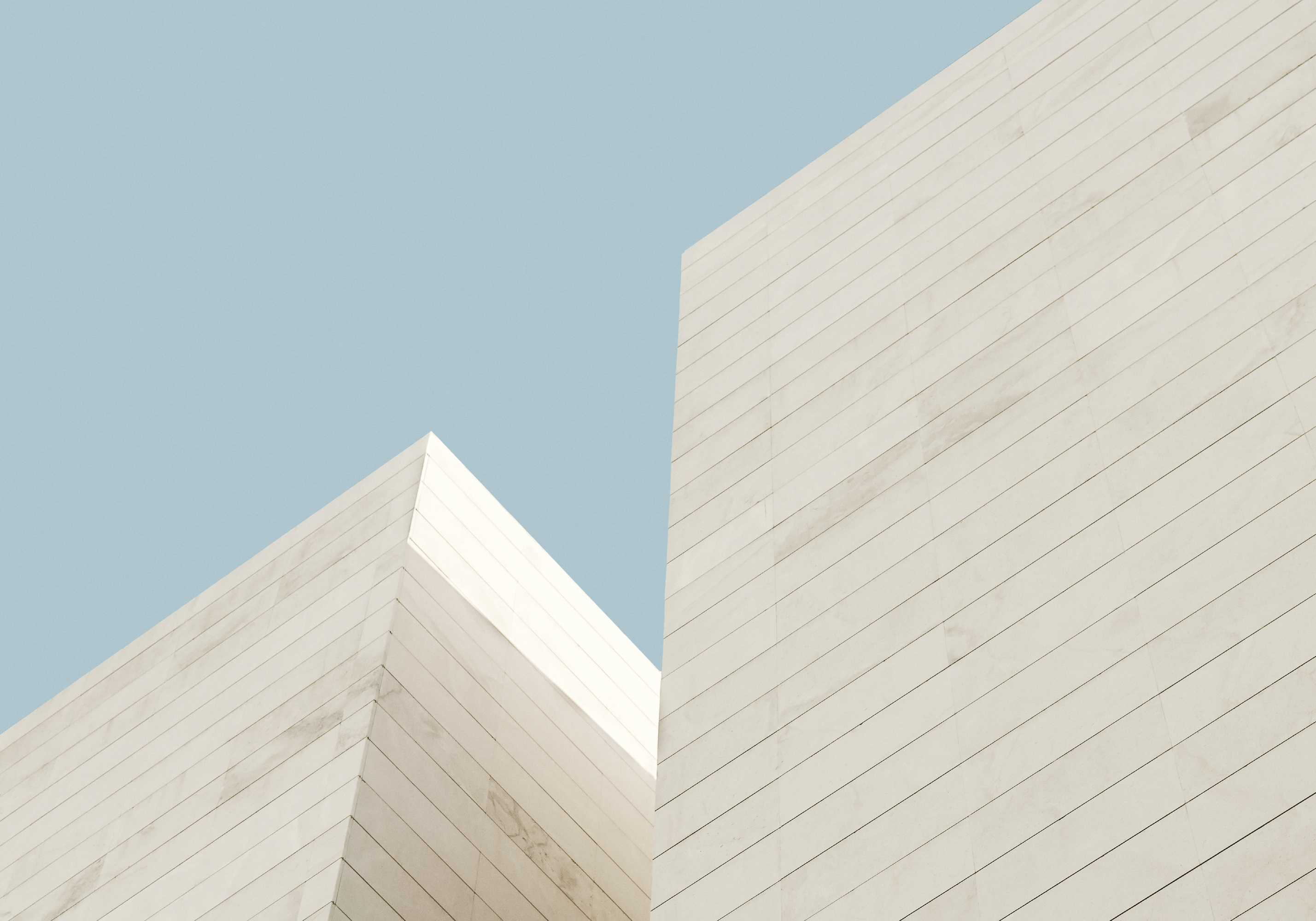 淡いベージュ色の建物が空に向かってそびえ立つ、シンプルでモダンなポスター。きれいな線と形が美しいデザインです。