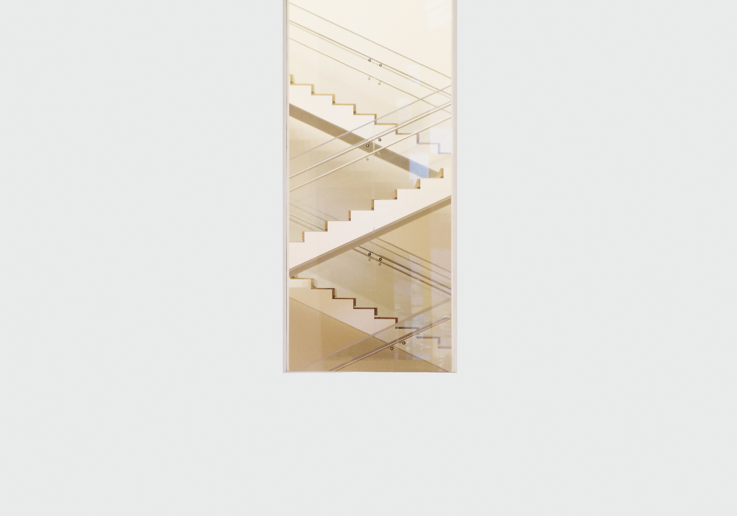 ジグザグの階段とベージュの背景が特徴的なモダンなポスター。金属の手すりと幾何学的なデザインが、清潔感のある空間を演出します。