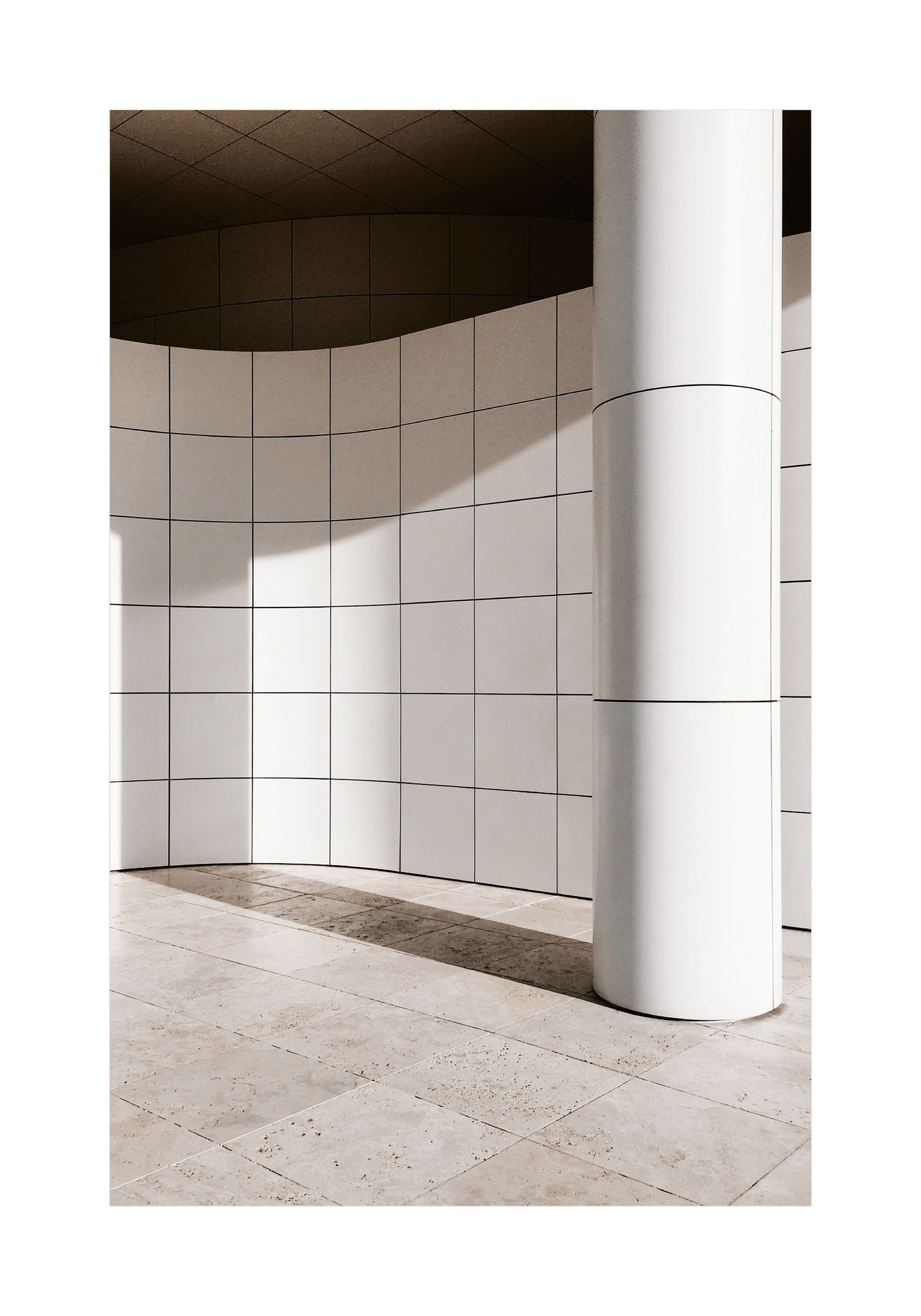 白い柱と曲線の壁が美しい建築アート。光と影が作る模様が空間に深みを与えます。ベージュとグレーの落ち着いた色合いが特徴のポスターです。