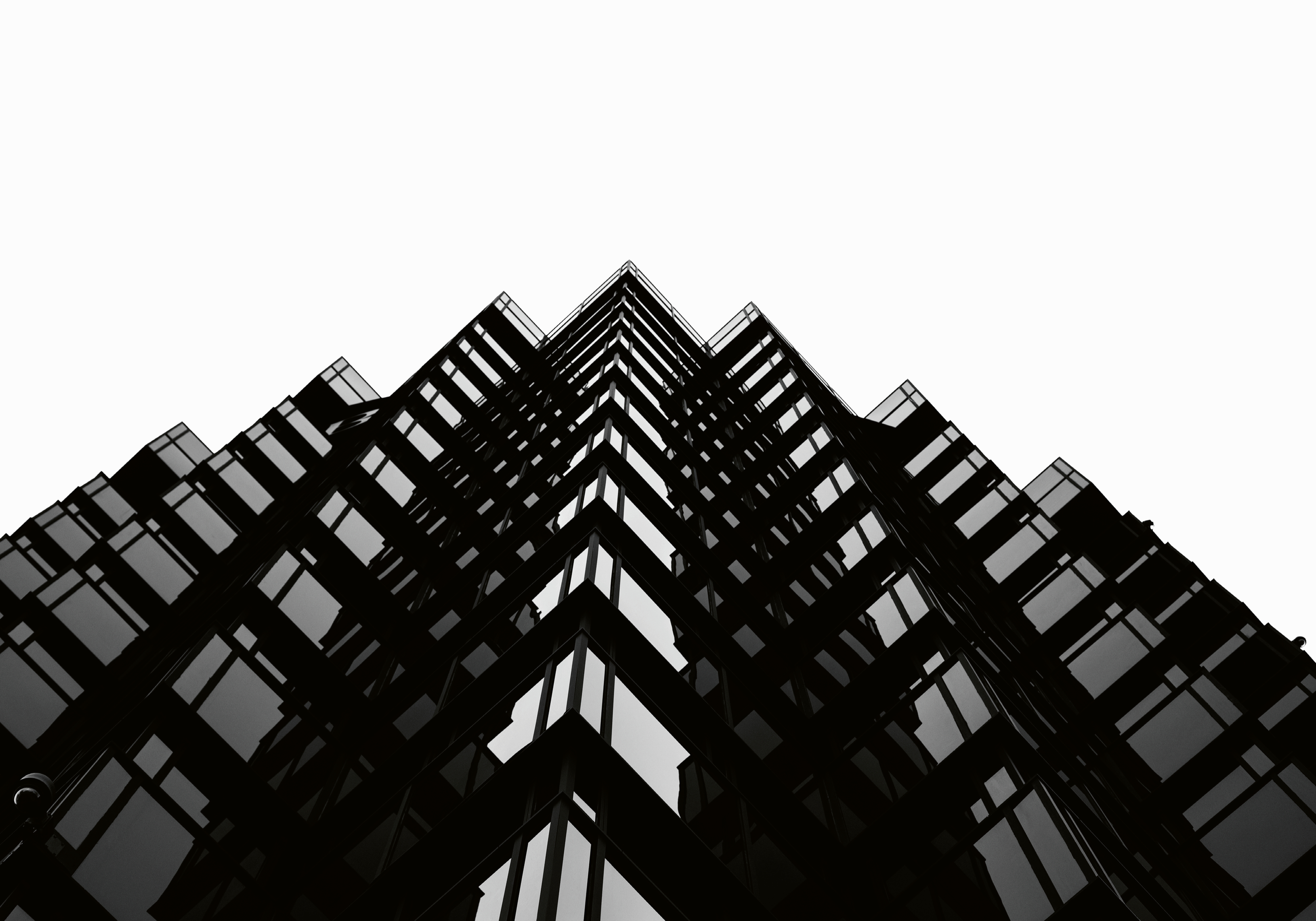 下から見上げた高いビルのポスターです。黒いガラスの建物が白い空と美しく対比しています。シンプルでモダンなデザインです。