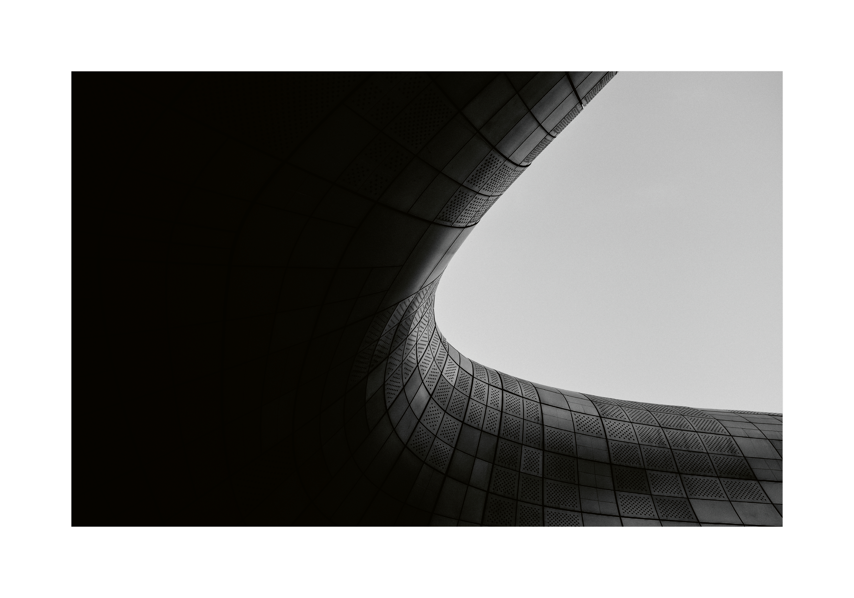 波のように曲がる建物のデザインポスター。四角い窓が並ぶモダンな建築アート。ダークトーンとライトグレーの空が美しいコントラストを作ります。