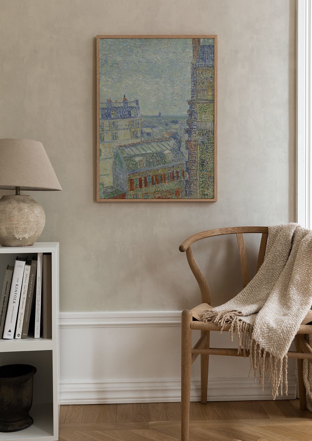 青と緑の屋根、赤い煙突が並ぶ街並みの絵です。右側の高い建物にはツタが這い、空は淡い青と黄色が混ざっています。ゴッホの特徴的な筆のタッチで描かれた美しい風景画のポスターです。