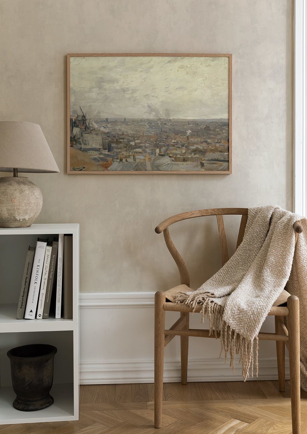 灰色と茶色の建物が広がる街並みの絵のポスターです。柔らかい雲が浮かぶ空の下、左側には風車が見えます。優しい筆のタッチで描かれた風景画です。