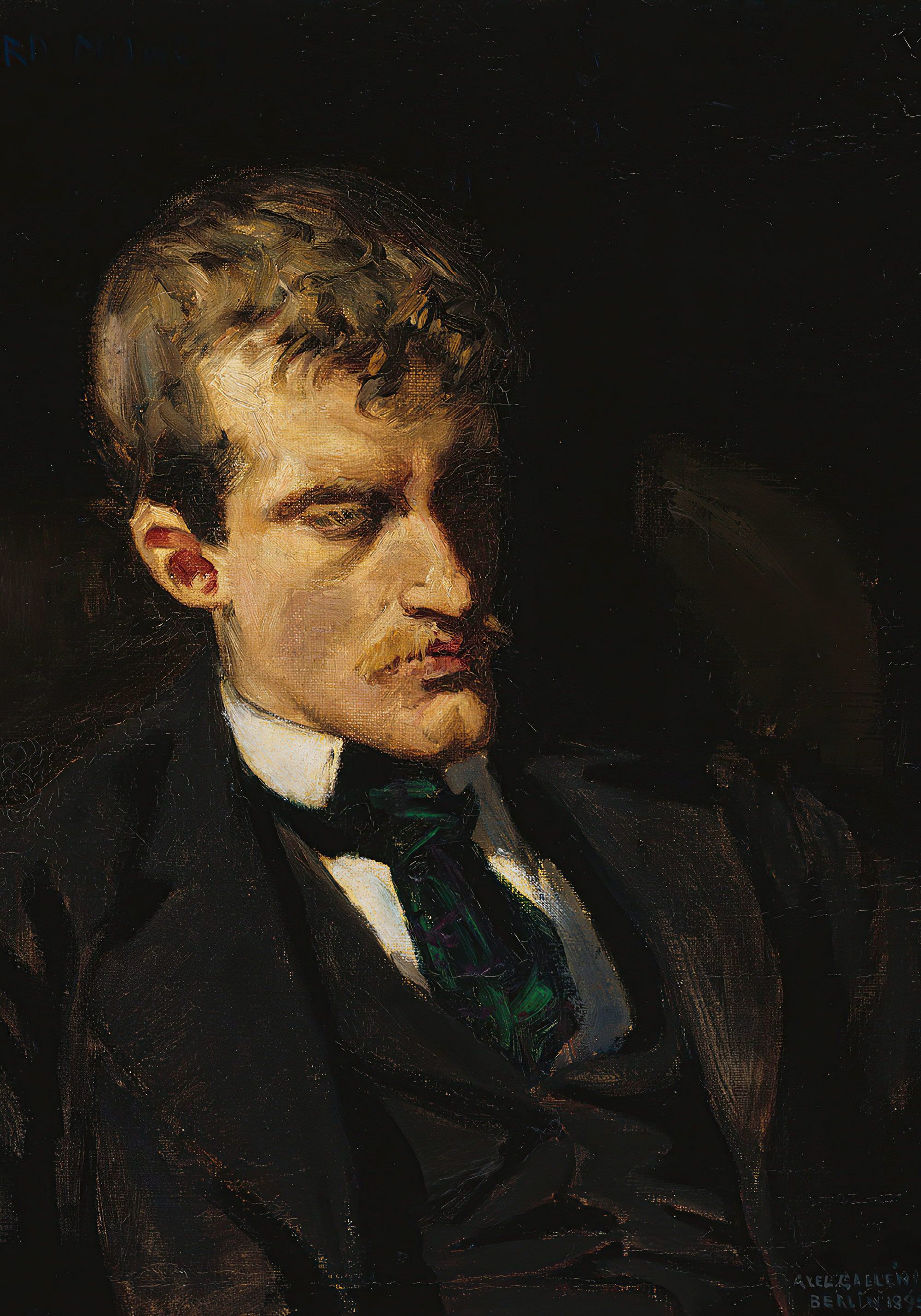 黒いスーツを着た男性の肖像画ポスターです。暗い背景に浮かぶ真剣な表情が印象的な作品です。