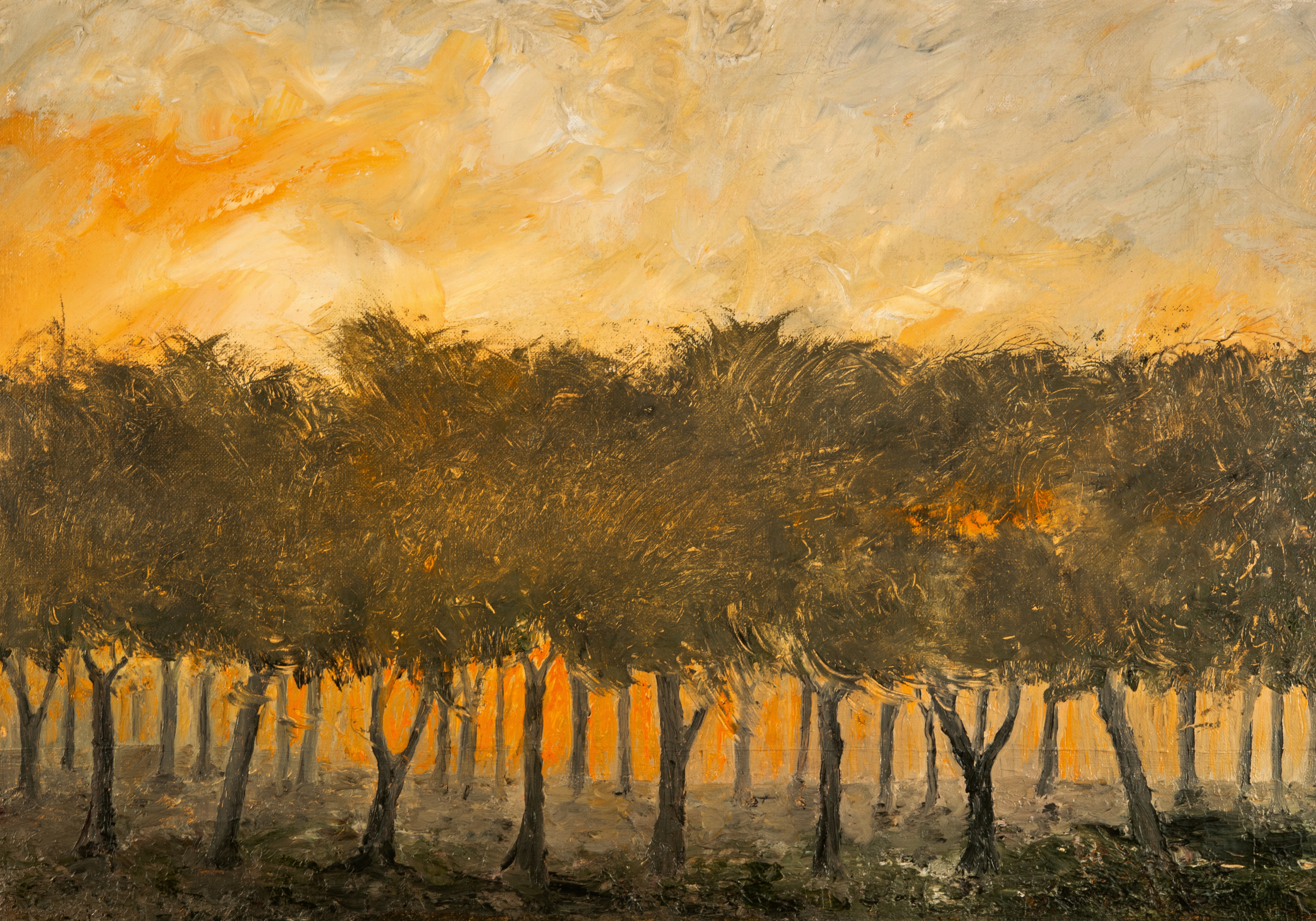 暗い幹と豊かな葉を持つ木々が、オレンジと黄色の空を背景に並んでいます。渦巻くような筆のタッチが空に質感を生み出し、暗い地面が明るい空とコントラストを作り出しています。