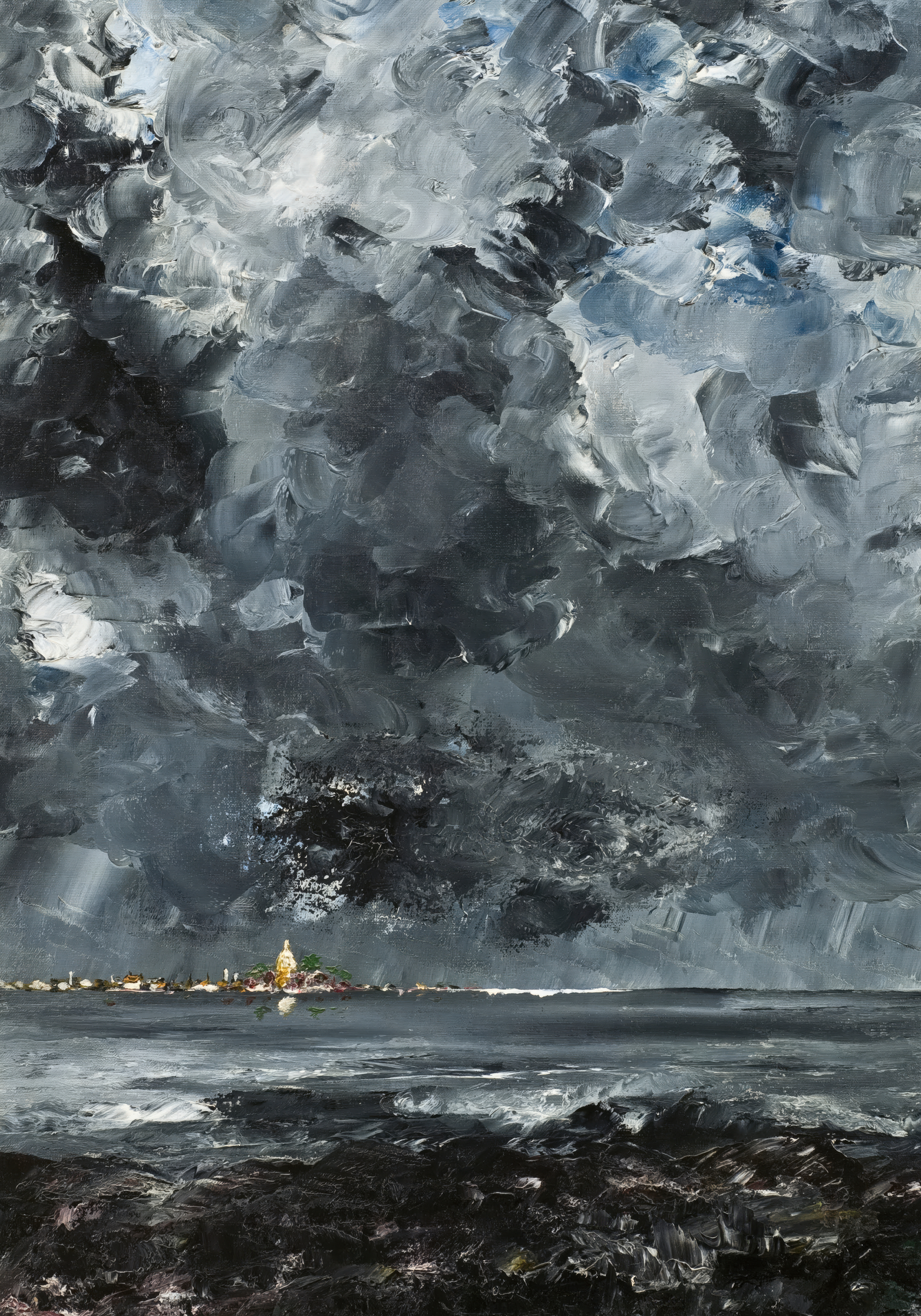 暗い雲が空を覆い、下には静かな海が広がります。遠くには小さな島が見え、金色の建物と緑の木々が描かれています。嵐のような雰囲気が感じられる、ドラマチックなポスターです。