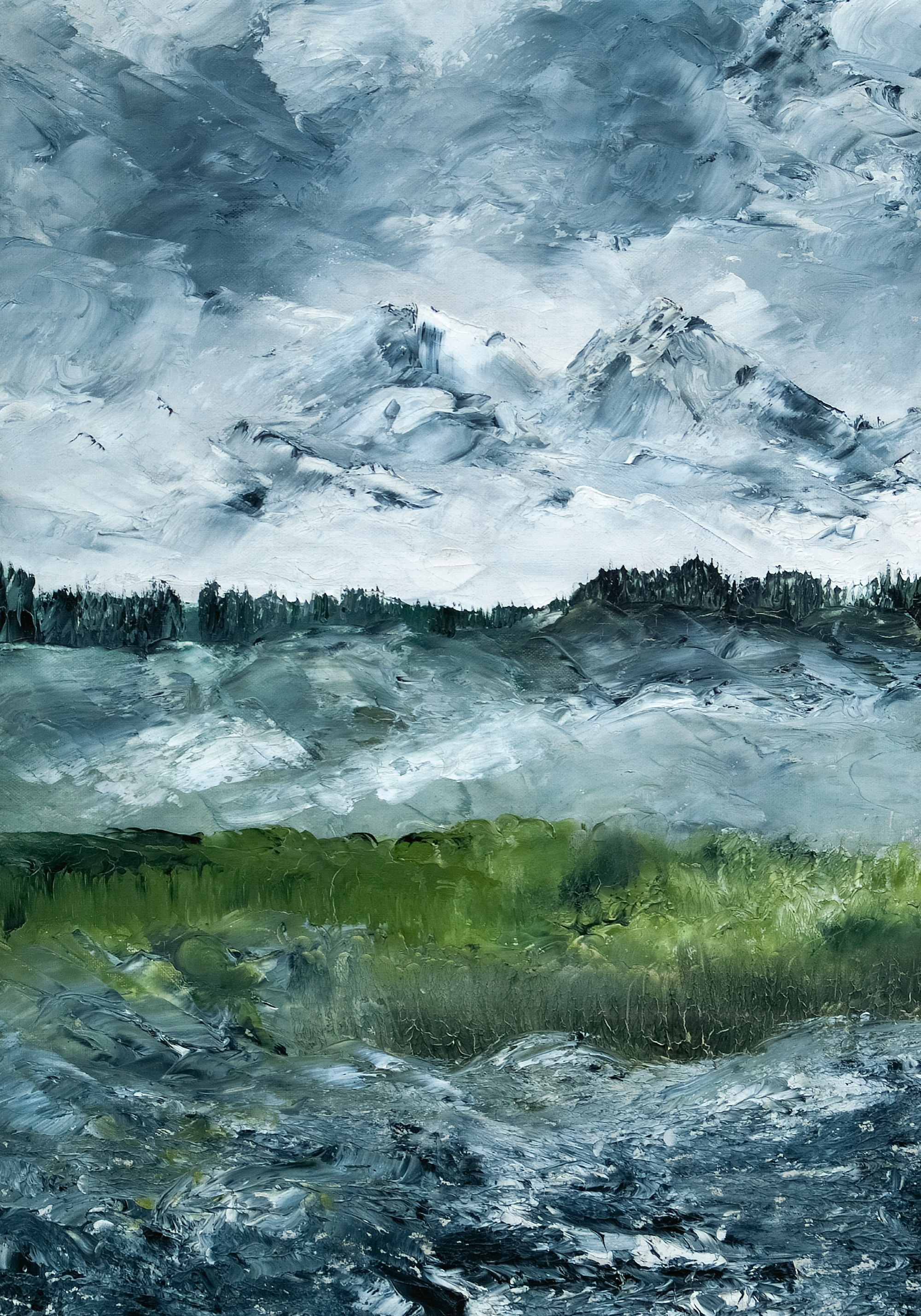 灰色の空と白い山々、深い緑の森、明るい緑の草原が描かれた風景画のポスターです。ラフな筆使いが特徴的な作品です。