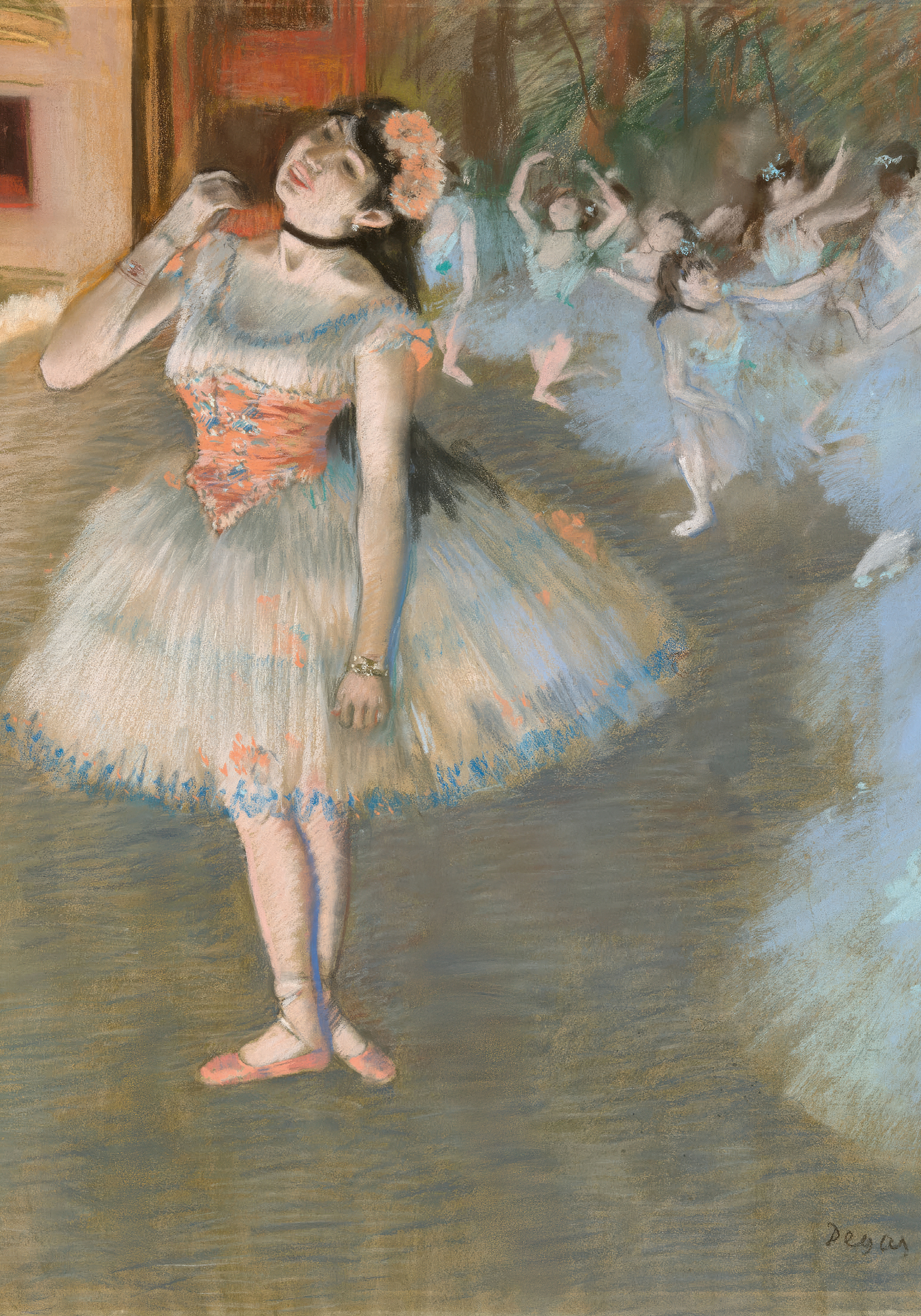 白いチュチュを着たバレリーナが優雅に踊る美しいポスター。ピンクと青のアクセントが柔らかい雰囲気を作ります。
